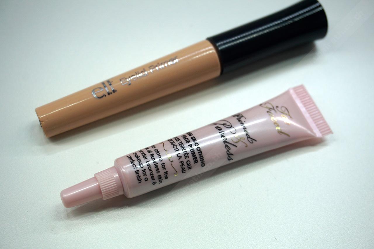 แนะนำ : ไพรเมอร์สำหรับผิวหน้าที่เราใช้อยู่คือ Too Faced Skin Smoothing Face Primer ตัวนี้ทาลงบางๆ ก็พอ ไม่ต้องใช้เยอะ พอทาลงไปแล้วจะเห็นว่ามันซึมซาบได้ดี ไม่มีสี ไม่ทิ้งคราบขาว ช่วยปกปิดรูขุมขนได้ดี ช่วยให้ผิวหน้าซับเครื่องสำอางในขั้นตอนต่อไปติดเนียนได้ดี ส่วนเปลือกตาแนะนำของ e.l.f. Eyelid primer ทาลงบางๆ ที่เปลือกตา ช่วยให้อายแชโดว์ติดทนนาน