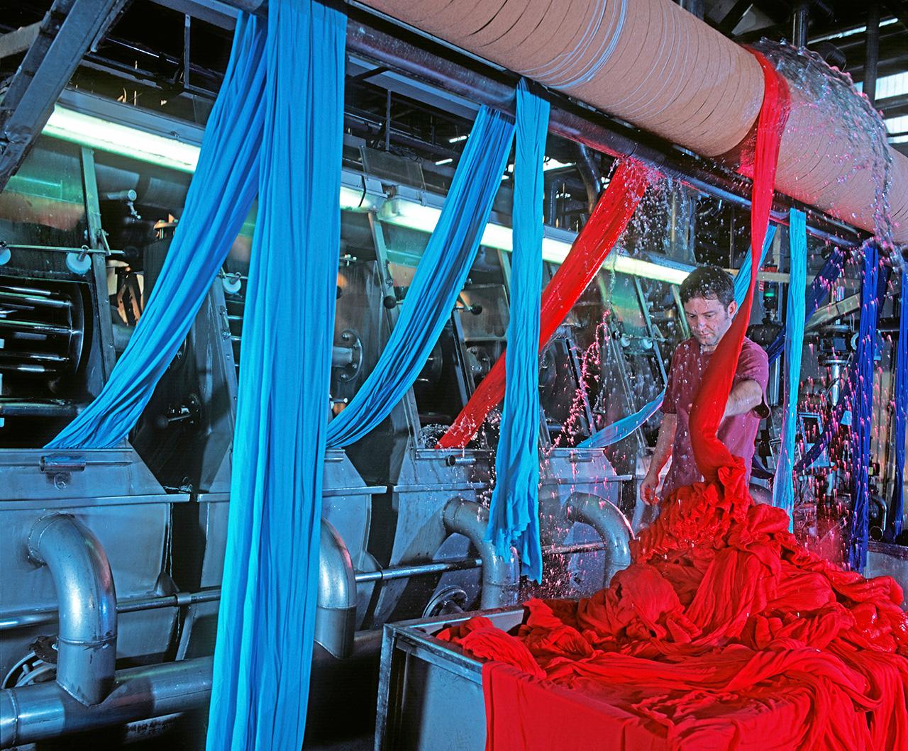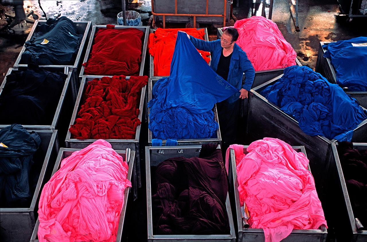 เมื่อผ่านขั้นตอนแรกไปแล้ว ก็มาถึงการชม “กระบวนการย้อมผ้า” สีที่ใช้ย้อมผ้าลาคอสท์ จะออกแบบโดยทีมวิจัยในกรุงปารีส เพื่อให้เกิดการผสมสีที่มีคุณภาพสูงสุด กว่าจะลงมือย้อมผ้าได้จริง ต้องนำสีทดสอบซ้ำแล้วซ้ำเล่ากับหลากหลายเนื้อผ้า เพื่อให้แน่ใจว่าไม่มีความเพี้ยนของสีในชนิดผ้าที่ต่างกัน เฉพาะกระบวนการถักทอผ้าและย้อมสี ใช้เวลารวมกัน 15 ชั่วโมง การย้อม 1 ครั้ง จะย้อมผ้าได้ 100 กิโลกรัม ทั้งนี้ ห้องปฏิบัติการในแผนกย้อม จะมีภารกิจ 3 ประการ คือ การผลิตสีต่างๆ, การควบคุมคุณภาพ และการทำงานวิจัยพัฒนา กว่าจะได้เสื้อโปโลแต่ละตัว ต้องประกอบด้วยชิ้นส่วนมากมาย โดยในขั้นตอนย้อมจะนำชิ้นงานทุกชิ้นที่ประกอบเป็นเสื้อมาย้อมสีพร้อมกัน เพื่อให้ได้ผลิตภัณฑ์สำเร็จรูปที่มีสีเป็นเนื้อเดียวกัน แล้วจึงนำไปซักเพื่อขจัดสีที่ไม่เกาะติดเส้นใย เฉพาะขั้นตอนย้อมต้องใช้เวลา 5-10 ชั่วโมง เมื่อเสร็จสิ้นจึงนำผ้าไปอบแห้ง ก่อนจะรีดเอาน้ำออก เพื่อให้ได้ผ้าถักที่มีขนาดคงที่ ไม่เสียรูปทรง