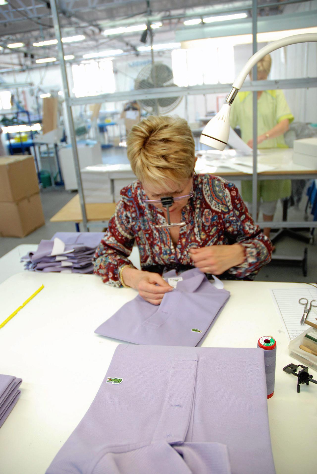 หลังจากเตรียมผ้าพร้อมแล้ว จึงเป็นเวลาของ “การตัด และเย็บประกอบเป็นตัว” พร้อมเก็บงานขั้นสุดท้าย งานแรกในกระบวนการตัดคือ การรับและตรวจสอบผ้าถัก ชิ้นผ้าถักจะถูกตรวจสอบและวัดเพื่อเตรียมงานสำหรับการตัด ผ้าถักจำนวนเท่าที่จำเป็นจะถูกแยกออกมาเพื่อผลิตสาบรังดุม หากการตรวจสอบเป็นที่น่าพอใจ คำสั่งผลิตต่างๆจะถูกดำเนินการโดยคอมพิวเตอร์ เมื่อตัดเสร็จ ชิ้นผ้าจะถูกนำไปติดสัญลักษณ์รูปจระเข้ สุดท้ายส่วนประกอบทั้งหมดจะถูกนำกลับมารวมกัน นับชิ้นและตรวจสอบ แต่ละชุดต้องมีส่วนประกอบของตัวเสื้อทั้งหมด ได้แก่ คอปกเสื้อ, ขอบริม และตัวเสื้อ เมื่อทุกอย่างเรียบร้อย ใบสั่งงานใหม่จะถูกจัดเตรียม และส่งไปกำกับการประกอบตัวเสื้อ จากนั้นเป็นขั้นตอนการรีด และตรวจคุณภาพด้วยตา ก่อนจะนำไปบรรจุในถุงและแพ็กลงกล่อง ลำเลียงไว้ในคลังเก็บสินค้า เตรียมส่งออกจากโรงงานไปขายทั่วโลก