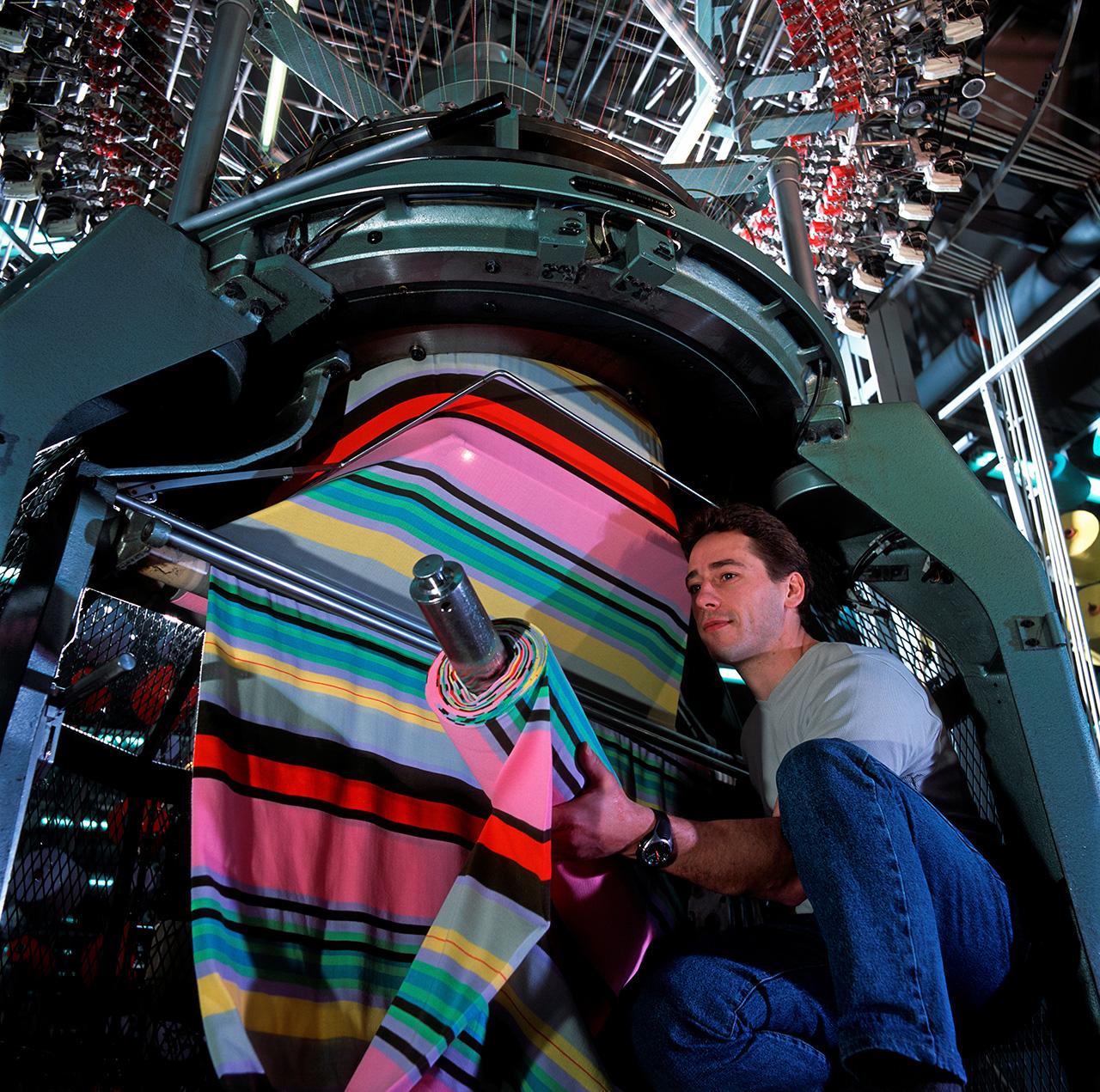โซนแรกที่เข้าไปเยี่ยมชมคือ “การถักทอผ้า” จะเห็นกระสวยด้ายถูกจัดเป็นกอง โดยมีหมายเลขอ้างอิง ทำให้ง่ายในการติดตามภายหลัง สำหรับผ้าถักที่ต้องนำไปย้อม ด้ายที่ใช้จะเป็นสีธรรมชาติ ส่วนการถักแบบมีลวดลาย ด้ายจะถูกย้อมสีมาแล้ว กระสวยแต่ละกองที่ได้รับมาจะถูกแยกออกอย่างเป็นระบบ เพื่อให้สามารถควบคุมขั้นตอนต่างๆสะดวก ขนาดของเส้นด้ายกำหนดมาตรฐานของด้ายหนัก 1 กิโลกรัม เท่าความยาว 75 กิโลเมตร ซึ่งเสื้อยืดโปโลลาคอสท์ 1 ตัว จะผลิตจากเส้นใยฝ้ายบริสุทธิ์ที่มีน้ำหนัก 230 กิโลกรัม โดยมีความยาวของเส้นใยฝ้ายบริสุทธิ์ 20 กิโลเมตร การตรวจสอบ แต่ละครั้งใช้เวลา 8 ชั่วโมง เครื่องจักรให้ข้อมูลทางสถิติที่มีความเที่ยงตรงสูง ทำให้ สามารถตัดสินได้ว่าเส้นด้ายนั้นมีคุณภาพตรงตามมาตรฐานหรือไม่ ขณะเดียวกัน ตัวอย่างจะถูกถักขึ้นเพื่อตรวจสอบและยืนยันความเหมือน ของสีให้ได้ตรงตามมาตรฐาน เมื่อคุณภาพของเส้นด้ายยืนยันว่าใช้ได้ ก็จะถูกนำไปกรอเป็นเส้นคู่ โดยใช้กระสวย 2 ตัว กรอด้ายร่วมกันออกมาเป็นหนึ่งเส้น ภายในโรงงานจะมีเครื่องดูดฝุ่นกำจัดเศษฝ้ายเพื่อให้มั่นใจเรื่องความสะอาดของเส้นด้าย