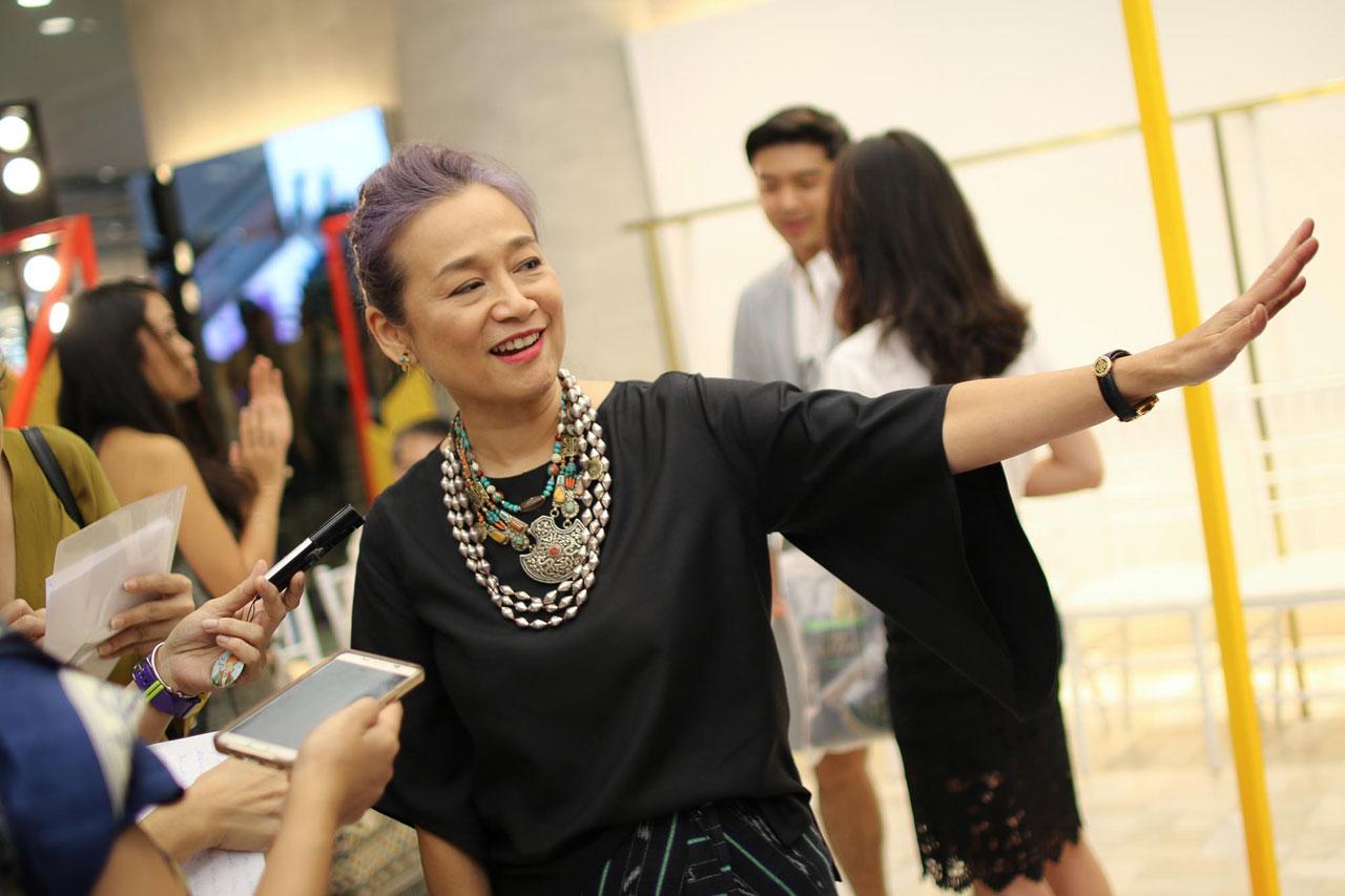 จริงๆ มันเหมาะกับทุกวัยนะ เพราะว่ามันสามารถเอาไปแมตช์กับอย่างอื่นได้ แยกเป็นชิ้นบน ชิ้นล่าง ก็ทำให้ดูเก๋ขึ้น แฟชั่นขึ้น คุณอาจคิดว่าผ้าไทยเป็นอะไรที่เฉยมาก ดูโบราณ-ใส่แล้วดูแก่มีอายุ แต่คอลเลกชั่นนี้จะทำให้มุมมองคุณเปลี่ยนไป ถึงจะเป็นไอเทมเดียวกัน ถ้าแต่ละคนเอาไปใส่ มันก็ออกมาไม่เหมือนกัน ยิ่งใส่ความเป็นตัวเองหยิบไปแมตช์กับตัวนี้ตัวนี้บ้าง มันยิ่งทำให้การแต่งตัวสนุกขึ้น อย่างชุดนี้ (ชุดข้างบน) ถ้าเอาไปแมตช์กับเสื้อเชิ้ต หรือเสื้อที่มันโก้ๆ หน่อยก็สามารถใส่ออกงานสังคมได้เลย