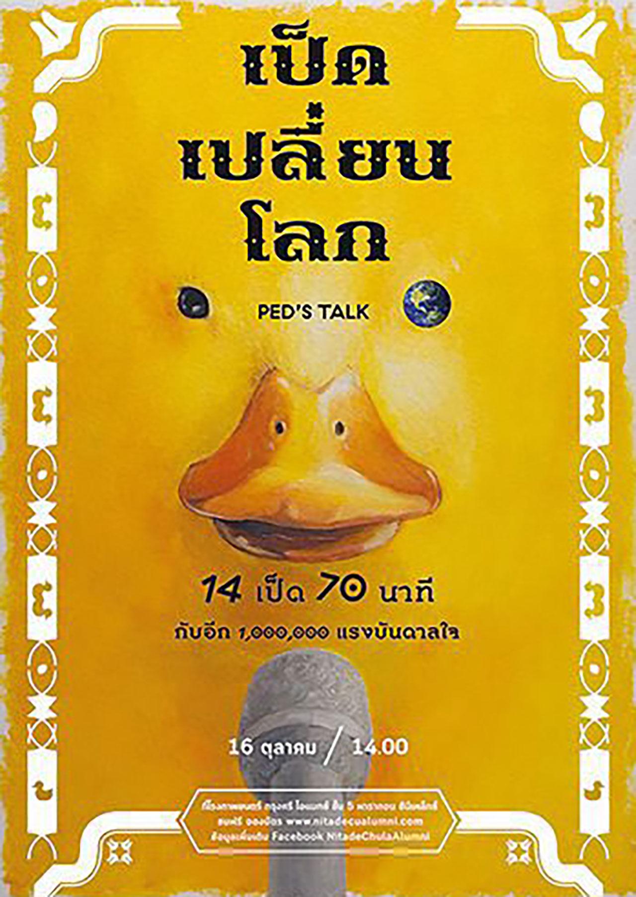สมาคมนิสิตเก่าคณะนิเทศศาสตร์ จุฬาฯ จัดทอล์คโชว์ “เป็ด เปลี่ยน โลก” โดยศิษย์เก่า อาทิ ศุ บุญเลี้ยง, นภาพร ไตรวิทย์วารีกุล, จิระ มะลิกุล, ครูเงาะ รสสุคนธ์ กองเกตุ ฯลฯ มาร่วมส่งต่อแนวคิดและแรงบันดาลใจในการขับเคลื่อนเปลี่ยนแปลงสังคมอย่างสร้างสรรค์ ในวันที่ 16 ต.ค. เวลา 13.30-15.00 น. ณ โรงภาพยนตร์ IMAX สยามพารากอน เข้าชมฟรี ลงทะเบียนออนไลน์ล่วงหน้าได้ทางเว็บไซต์ www.nitadechulaalumni.com และเฟซบุ๊ก Nitade Chula Alumni