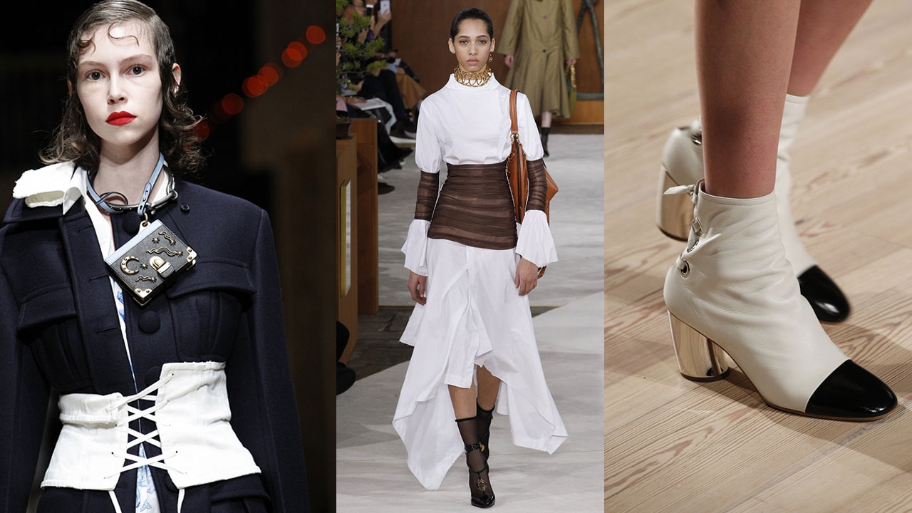 แฉลบสีขาวยังแผ่ลามไปถึงแอ็กเซสเซอรี่ และไม่มีอะไรจะป่าวประกาศว่า “ฉันดูแพง” ได้มากกว่านี้อีกแล้ว ที่ Balenciaga ผู้อำนวยการฝ่ายสร้างสรรค์ Demna Gvasalia สูบฉีดพลังขับเคลื่อนใหม่ให้กับสูทลายตารางโครงทรงหนาหนักและเสื้อคอเต่าเงาวาวสีม่วงไวโอเลตด้วยการจับคู่กับรองเท้าบู๊ตสีขาวโพลน เป็นอิทธิพลของสีขาวเจิดจ้าเหล่านี้ที่ส่งเสริมให้รันเวย์ลุคยิ่งดูน่าปรารถนาถึงขีดสุด (แต่ต้องทำใจว่าทิชชูเปียกจะกลายเป็นคู่ซี้ใหม่ของคุณเพราะต้องหมั่นเช็ดรอยเปื้อนอยู่นั่น) แต่ถ้าคุณมิหาญกล้าใช้กระเป๋าสีขาวล้วน มองมาที่ Mulberry สิแล้วจะพบคำตอบ เพราะ Johnny Coca ครีเอทีฟไดเร็กเตอร์คนใหม่ดึงลวดลายลวงตาสีขาวมาขนาบข้างด้วยสีเข้มอย่างสีดำและสีไวน์ แถมยังทำแบบเดียวกันนี้กับรองเท้าด้วย