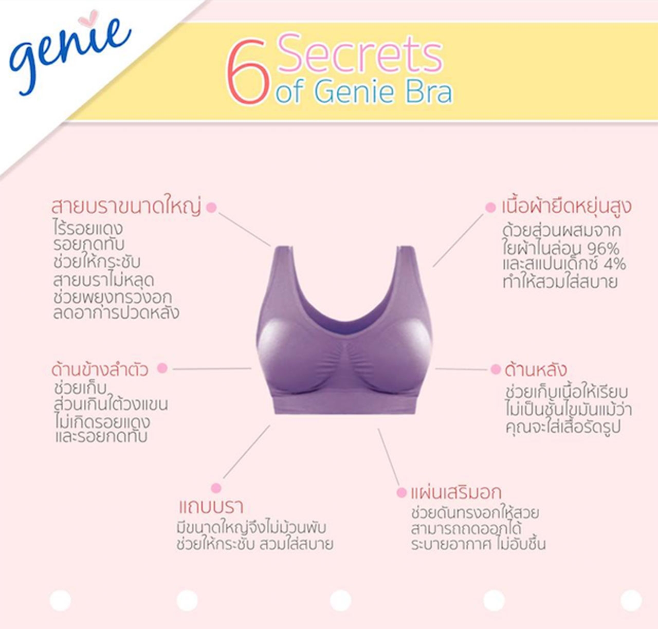 เนื้อผ้าของ Genie Bra ผลิตจากผ้าไนลอน 96% และสแปนเด็กซ์ 4% ทำให้มีความยืดหยุ่นสูง ยืดเท่าไรเนื้อผ้าก็ไม่ย้วย พร้อมกับฟองน้ำรองที่ถูกออกแบบมาเป็นอย่างดี ทำให้สามารถถอดฟองน้ำออกมาเพื่อทำความสะอาดได้ (เพื่อยืดอายุการใช้งานของฟองน้ำ) แถบรัดใต้ฐานหน้าอกของ Genie Bra จะช่วยยกกระชับหน้าอกให้เข้ารูปมาขึ้น เนื่องจากมีความยืดหยุ่นของเนื้อผ้าสูง ทำให้ไม่เป็นรอยแดง และไม่รู้สึกอึดอัดเวลาสวมใส่ นอกจากจะสวมใส่ได้กับเสื้อผ้าหลายสไตล์ ยังสามารถใส่ออกกำลังกายได้อีกด้วย