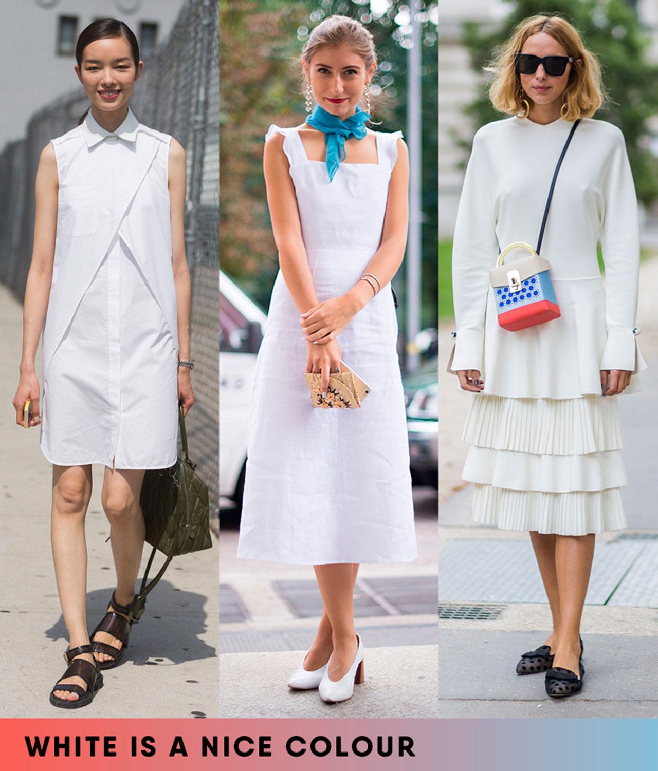 1. เดรสขาว + แจ็กเกตยีนส์ = เดรสเรียบๆ สีพื้นๆ เท่ขึ้นด้วยแจ็กเกตยีนส์ ยิ่งถ้าเป็นเดรสแขนกุดหรือสายเดี่ยว แจ็กเกตยีนส์จะช่วยให้คุณสุภาพขึ้นทันตา