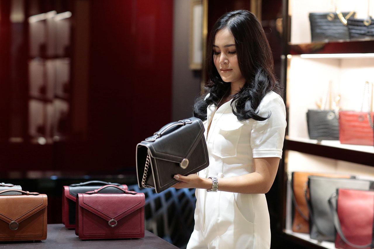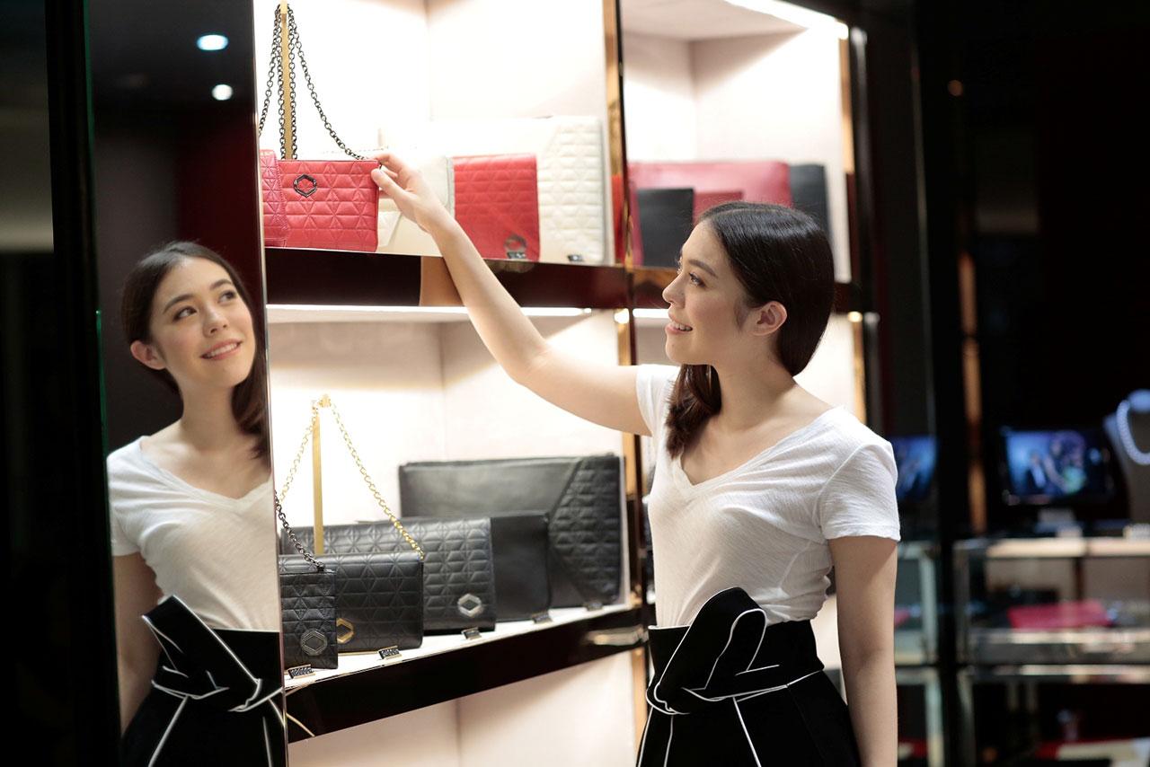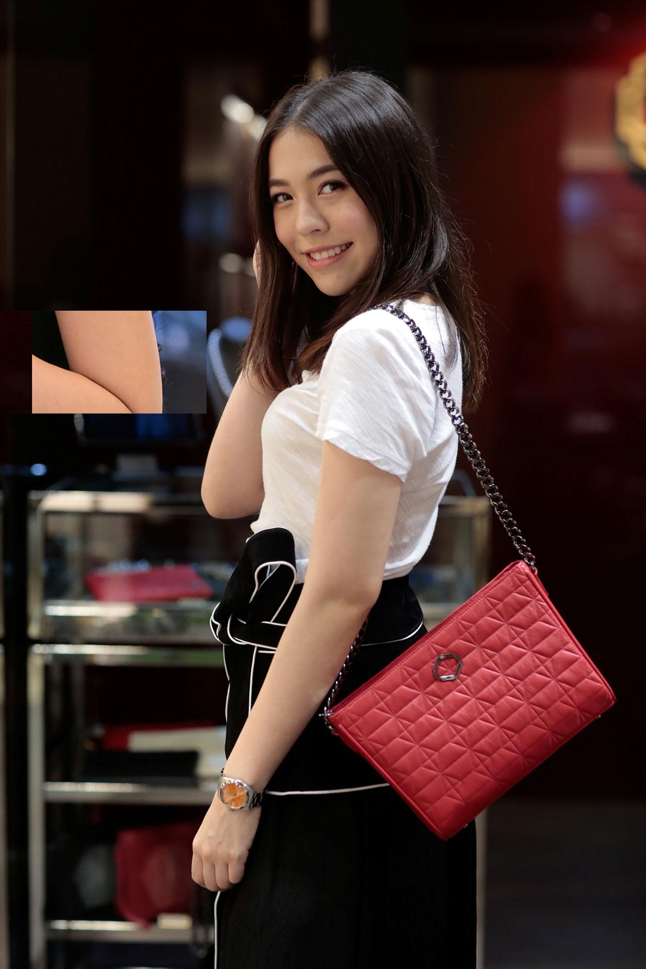 จริงๆ แล้ว เวลาแต่งตัว เราจะให้ความสำคัญที่รองเท้าและกระเป๋ามาก เพราะเราเป็นคนแต่งตัวเรียบ รองเท้ากับกระเป๋าก็ต้องเด่น กระเป๋าก็จะชอบใบที่เด่นกว่าชุดไปเลย ส่วนใหญ่จะเลือกจากลวดลายของหนัง และดีไซน์ที่เรียบโก้ อย่างวันนี้เราใส่ชุดสีดำ รองเท้าสีดำ กระเป๋ารุ่นโอลิเวีย ทั้งสีน้ำเงินและเขียวทำให้เรารู้สึกว่าพอถือแล้ว สามารถทำให้เราดูดีขึ้นได้ ด้วยทรงกระเป๋าที่ไม่เล็กเกินไป แล้วก็ลวดลายของหนังจระเข้ที่มีความโดดเด่น พอถือแล้วมั่นใจรู้สึกได้ถึงความหรูหรา ก็เลยเลือกมาแมตช์กับชุดวันนี้’