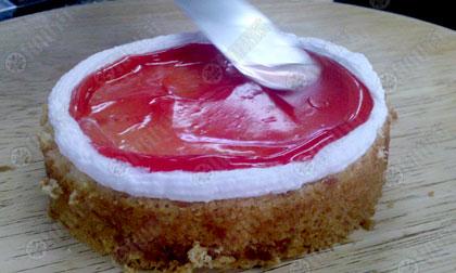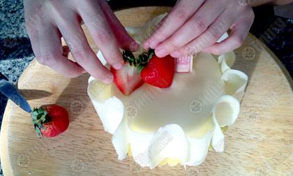 วิธีประกอบ 1). ปาดเค้กแบ่ง ออกเป็น 2 ส่วนเท่าๆกันตามขวาง 2). นำสตรอเบอร์รี่ซอสที่ข้นดีแล้วมาปาดบนเค้กชั้นแรก และประกบด้วยเนื้อเค้กอีก 1 ชั้น 3). นำวิปครีมออกจากตู้เย็น ปาดให้ทั่วชิ้นเค้ก 4). นำเค้กไปแช่เย็นจนครีมอยู่ตัว 5). ราดเค้กด้วยซอสช็อกโกแลตที่เย็นดีแล้ว 6). ตกแต่งด้วยแผ่นช็อกโก–แลตขาวโดยรอบเค้ก และสตรอ–เบอร์รี่สด.