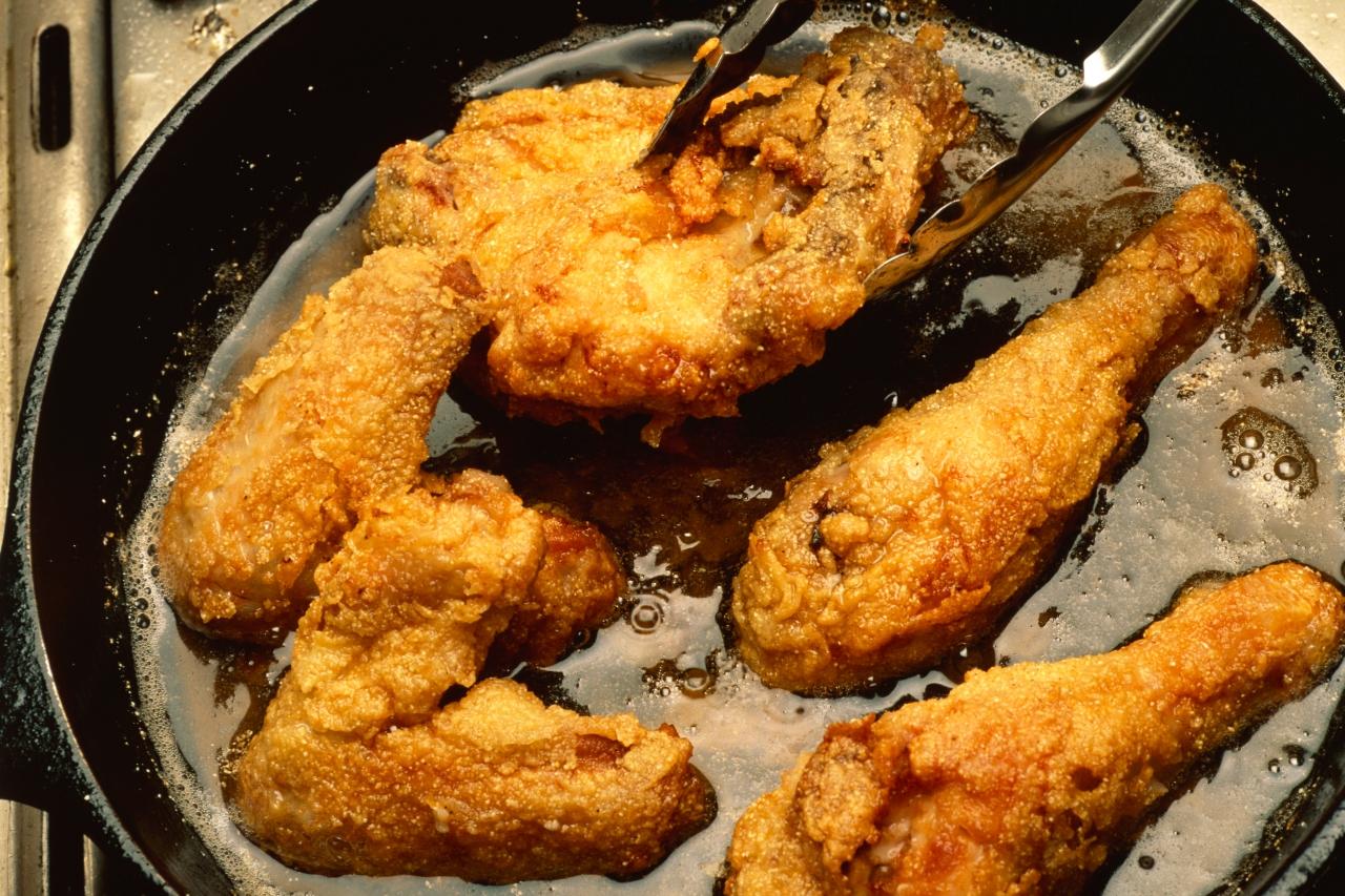 5. ตั้งเตา ใส่น้ำมันลงกระทะปริมาณเยอะหน่อย รอให้ร้อน (ใช้น้ำมันถั่วเหลืองหรือน้ำมันรำข้าวจะอร่อยกว่าใช้น้ำมันปาล์ม) ใช้ไฟปานกลาง นำไก่ลงทอด