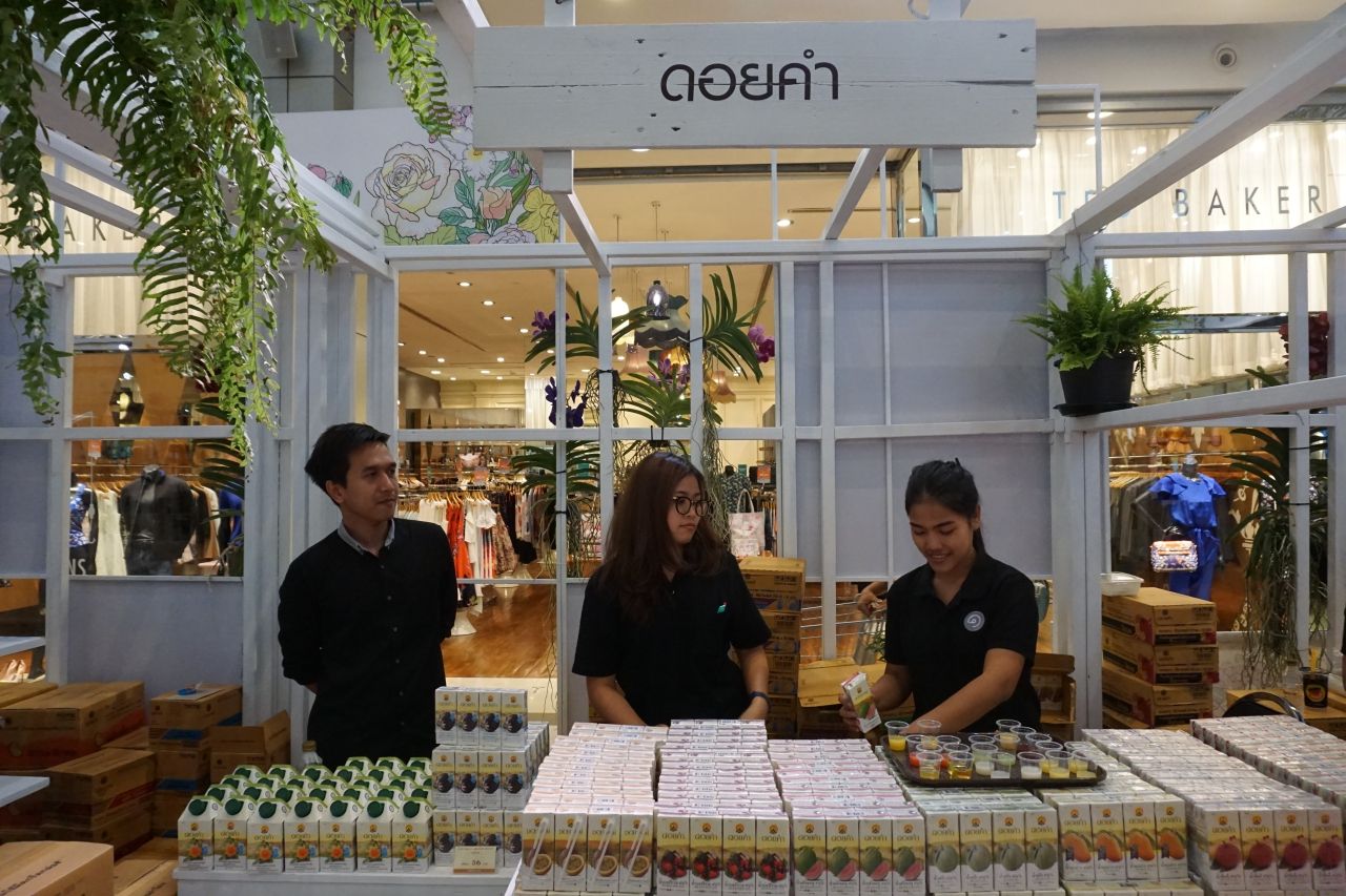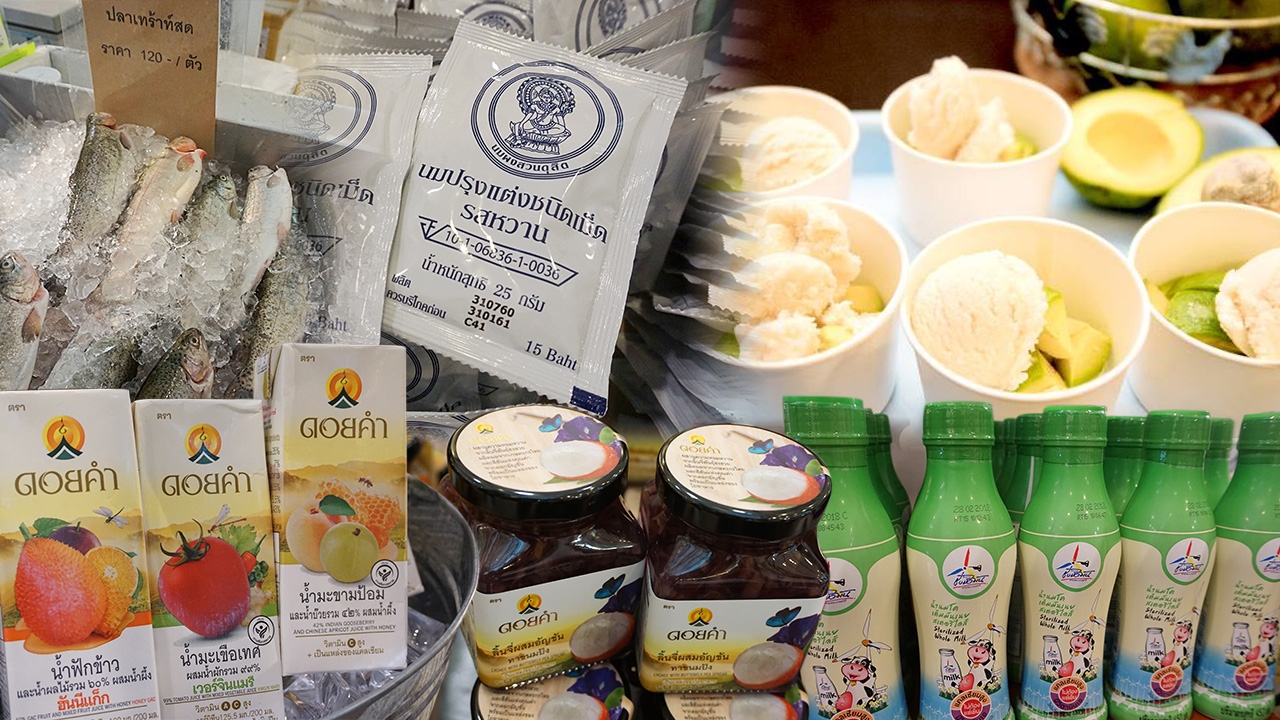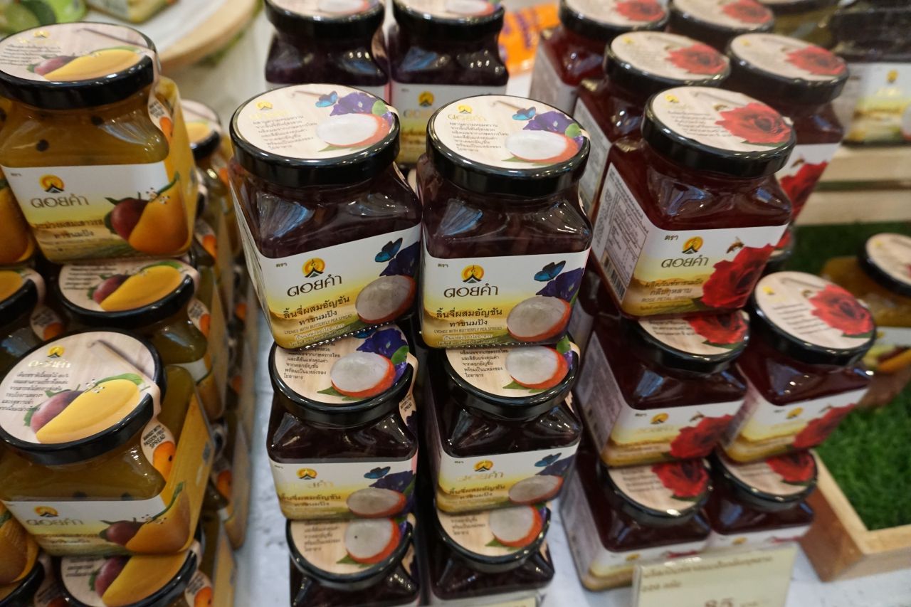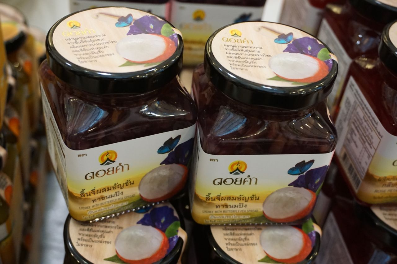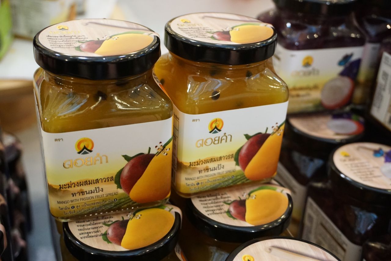 มาถึงผลิตภัณฑ์โครงการหลวงที่คุ้นเคยกันดีอย่าง ‘ดอยคำ’ ปีนี้เขามีผลิตภัณฑ์ใหม่ๆ รสชาติใหม่ ออกมาให้ลองซื้อไปรับประทาน เริ่มจากแยมผลไม้ เมื่อก่อนจะมีแค่แยมสตรอเบอร์รี่ ส้ม มะนาว กุหลาบ แต่ปีนี้ขอเสนอรสชาติใหม่ ได้แก่ แยมมะม่วงเสาวรส และแยมลิ้นจี่อัญชัญ