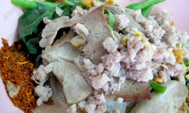 พี่เตี้ยใช้หมูส่วนที่มีเนื้อติดกระดูก อ่อน หรือที่เรียกว่าใบพาย นำมาหั่นเป็น ชิ้นกำลังน่าหม่ำ ไม่เล็กจนเสียอารมณ์ และไม่ใหญ่เกินไปจนคับปาก ขนาดพอให้อมๆ เคี้ยวๆ ได้ง่ายสบายเหงือก (หุหุ)
