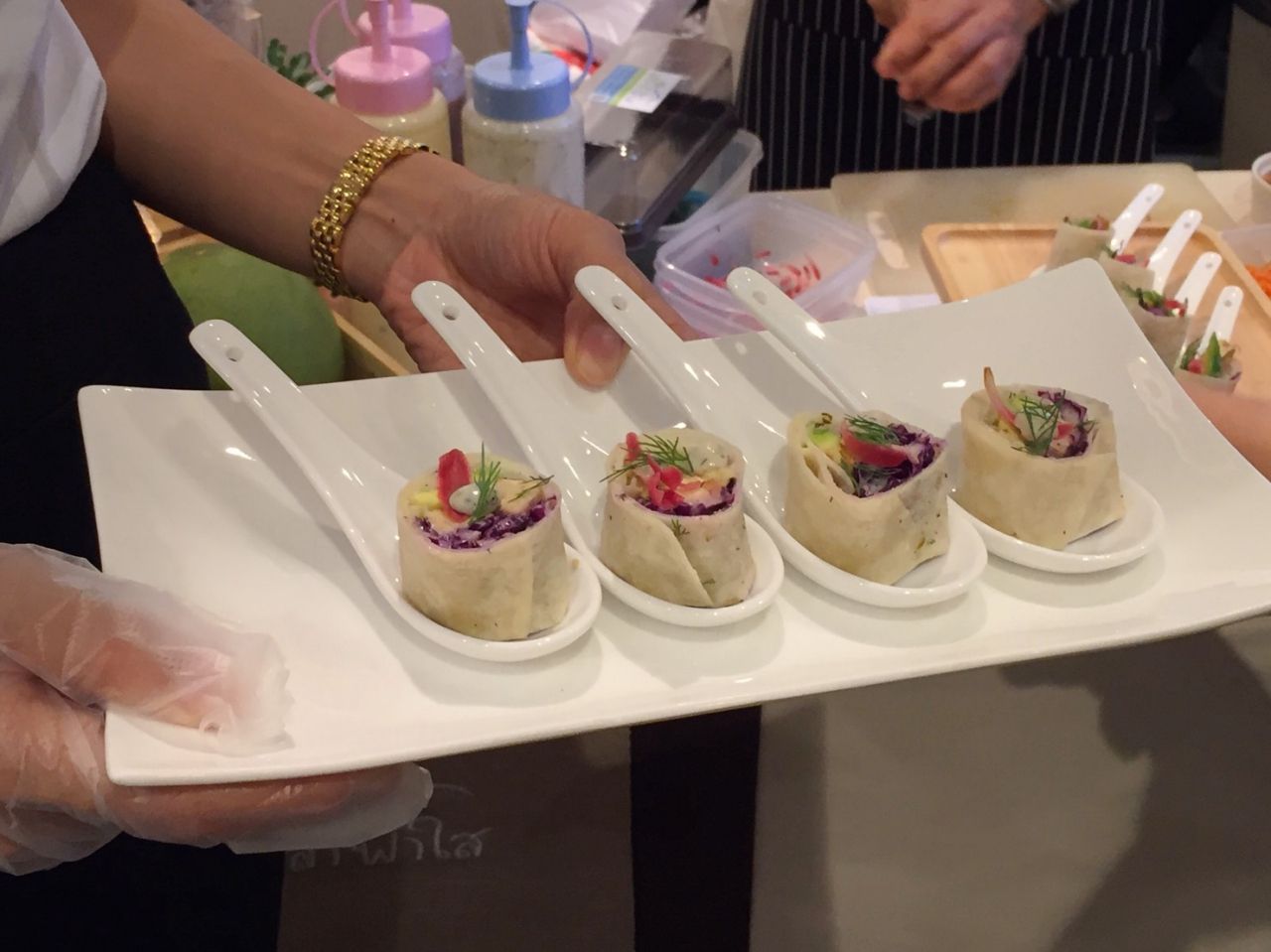ปิดท้ายกันที่เมนูสุขภาพ เป็นอาหารวีแกนแท้ 100% สำหรับคนที่ทานมังสวิรัติ ต้องยกให้จานนี้ ทอร์เทียอาโวคาโดสมุนไพร ภายในแผ่นทอร์เทียอัดแน่นด้วยเทมเป้ที่เป็นแหล่งโปรตีนจากถั่วเหลือง ใส่อาโวคาโดที่มีไขมันดีต่อสุขภาพ เพิ่มกะหล่ำปลีม่วง และแตงกวา โรยหน้าด้วยผักชีลาวและดอกดาหลา อัดแน่นไปด้วยสมุนไพรเต็มคำ เป็นเมนูน้ำตาลน้อย ทานแล้วไม่อ้วนนะจ๊ะ