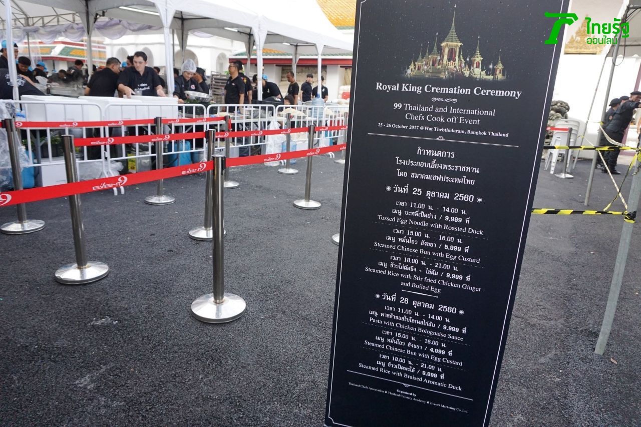 ส่วนเมนูอาหารมื้อพิเศษที่เชฟปรุงมาเสิร์ฟกันอย่างสุดฝีมือ แถมยังเป็นพระกระยาหารทรงโปรดของในหลวง รัชกาลที่ 9 อีกด้วย ได้แก่ วันที่ 25 ต.ค. จะมีบะหมี่เป็ดย่าง 9,999 ชุด, หมั่นโถวสังขยา 5,999 ชุด, ไก่ผัดขิง+ไข่ต้ม 9,999 ชุด