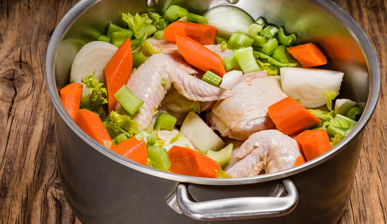 5. หลังจากผ่านไปประมาณ 10 นาที ไก่และผักต่างๆ สุกจนทั่วแล้ว ให้ลดไฟลงเป็นไฟอ่อน เคี่ยวต่ออีกประมาณ 30 นาที ระหว่างนี้จะมีฟองและไขมันลอยขึ้นมาบนผิวน้ำซุป ให้คอยช้อนฟองออกเรื่อยๆ น้ำซุปจะได้ใส น่ารับประทาน