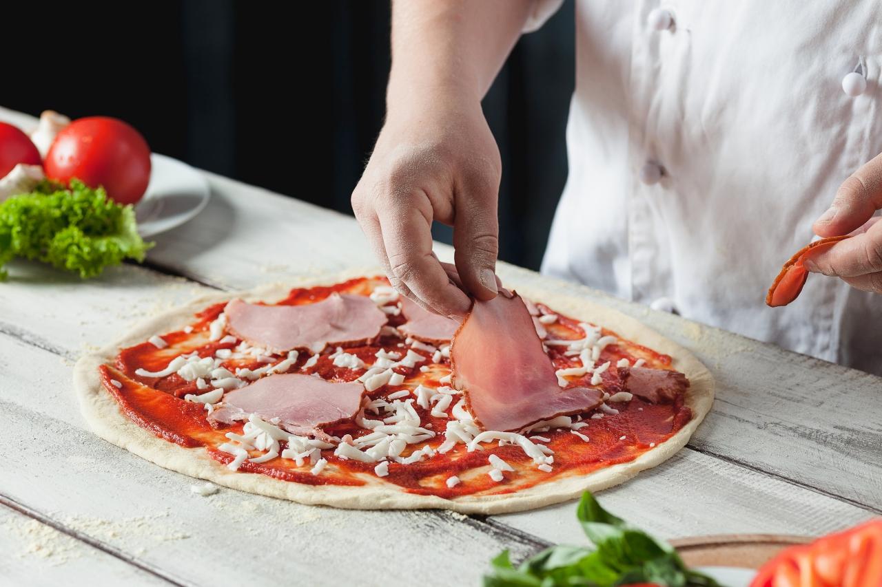 3. เครื่องที่จะมาวางบนพิซซ่า ผักต่างๆ ให้ล้างสะอาด หั่นเป็นชิ้นเตรียมไว้ แฮมหรือแซลมอนรมควัน หั่นเป็นชิ้นๆ เช่นกัน ส่วนพวกซีฟู้ดก็ต้องล้าง หั่น และลวกให้สุกเตรียมไว้เลย