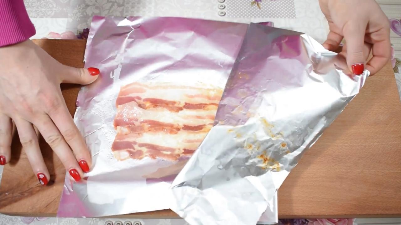 นำเบคอน หรือไส้กรอกที่หั่นบางๆ มาวางเรียงในแผ่นฟอยล์ห่ออาหาร วางชิดขอบแผ่นฟอยล์ด้านหนึ่ง เหลือพื้นที่ว่างไว้อีกด้าน แล้วพับฟอยล์เข้ามาให้หุ้มเบคอนไว้จนมิด จากนั้นใช้เตารีดตั้งความร้อนสูงสุด วางนาบลงไป รอ 1 นาที ยกเตารีดออก แล้วแกะแผ่นฟอยล์ ก็จะได้เบคอนร้อนๆ หอมกรุ่นเหมือนออกจากเตา