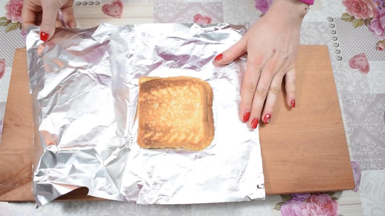 นำขนมปังมา 2 แผ่น ใส่ชีสแผ่นลงไปตรงกลาง แล้วเอาขนมปังประกบกัน จากนั้นทาเนยบนขนมปังด้านนอกเล็กน้อย จากนั้นนำกระดาษฟอยล์มาห่อขนมปัง ใช้เตารีดตั้งความร้อนสูงสุด นาบลงไปบนขนมปัง 1 นาที จากนั้นกลับด้านขนมปัง เอาเตารีดนาบอีก 1 นาที แกะกระดาษฟอยล์ออกมา ก็จะได้ขนมปังปิ้งไส้ชีสยืดๆ ร้อนๆ ผิวด้านนอกกรอบเกรียมเหมือนย่างบนเตาเลย