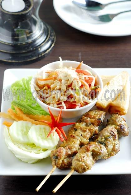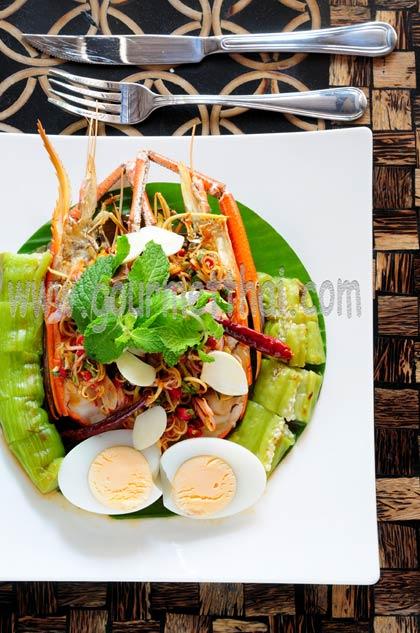 นอกจากบรรยากาศจะดีแล้ว เรื่องอาหารก็พลาดไม่ได้ วันนี้เลยนำมาโชว์ให้น้ำลายสอกันเล่นๆ อย่างจานแรก พล่ากุ้งมะเขือเผา ใช้กุ้งแม่น้ำปรุงเป็นพล่าที่หนักด้วยตะไคร้สด กินเคียงกับมะเขือเผาและไข่ต้มยางมะตูม จานต่อมาเป็นสูตรอาหารจานโปรดของคุณพ่อคุณแม่ ต้มยำไก่บ้านไข่อ่อนยอดมะขาม สูตรนี้ออกเปรี้ยวอร่อยด้วยยอดมะขามอ่อน พิเศษด้วยไข่อ่อน มาที่นี่เรียกว่าทั้งสบายตัวและอิ่มท้องในคราวเดียวจริงๆ