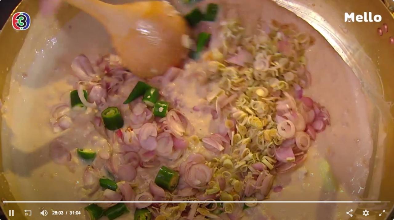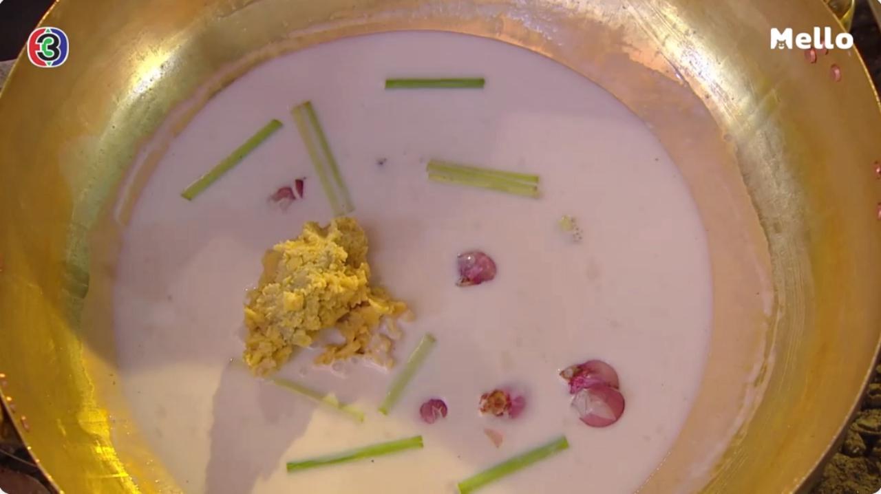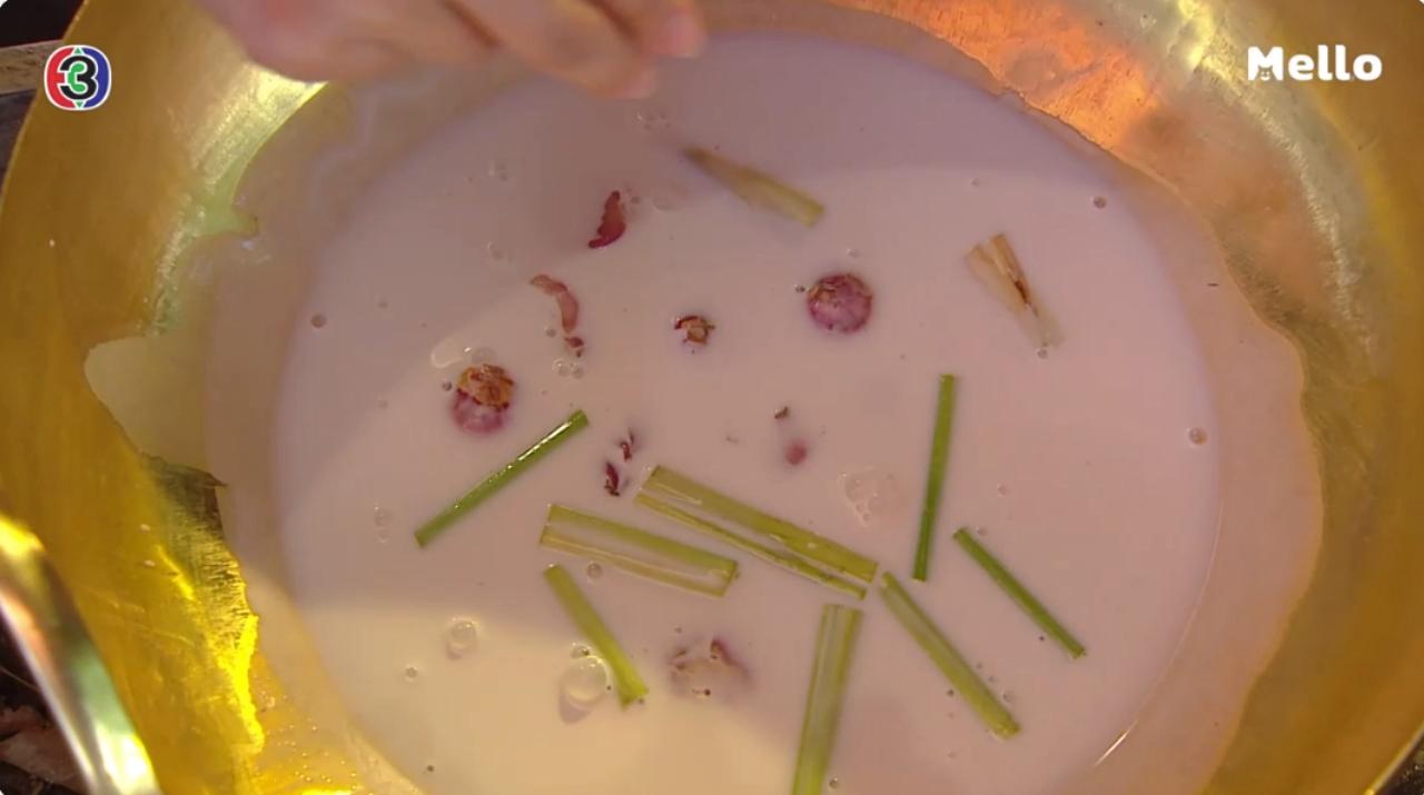 3. นำหางกะทิประมาณ 1 ถ้วยตวง ใส่หม้อขึ้นตั้งไฟ รอให้เดือด จากนั้นใส่หอมแดงทุบ ตะไคร้หั่นท่อน ลงไป เติมเกลือลงไปเล็กน้อย คนให้เข้ากัน