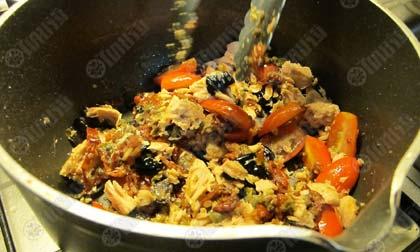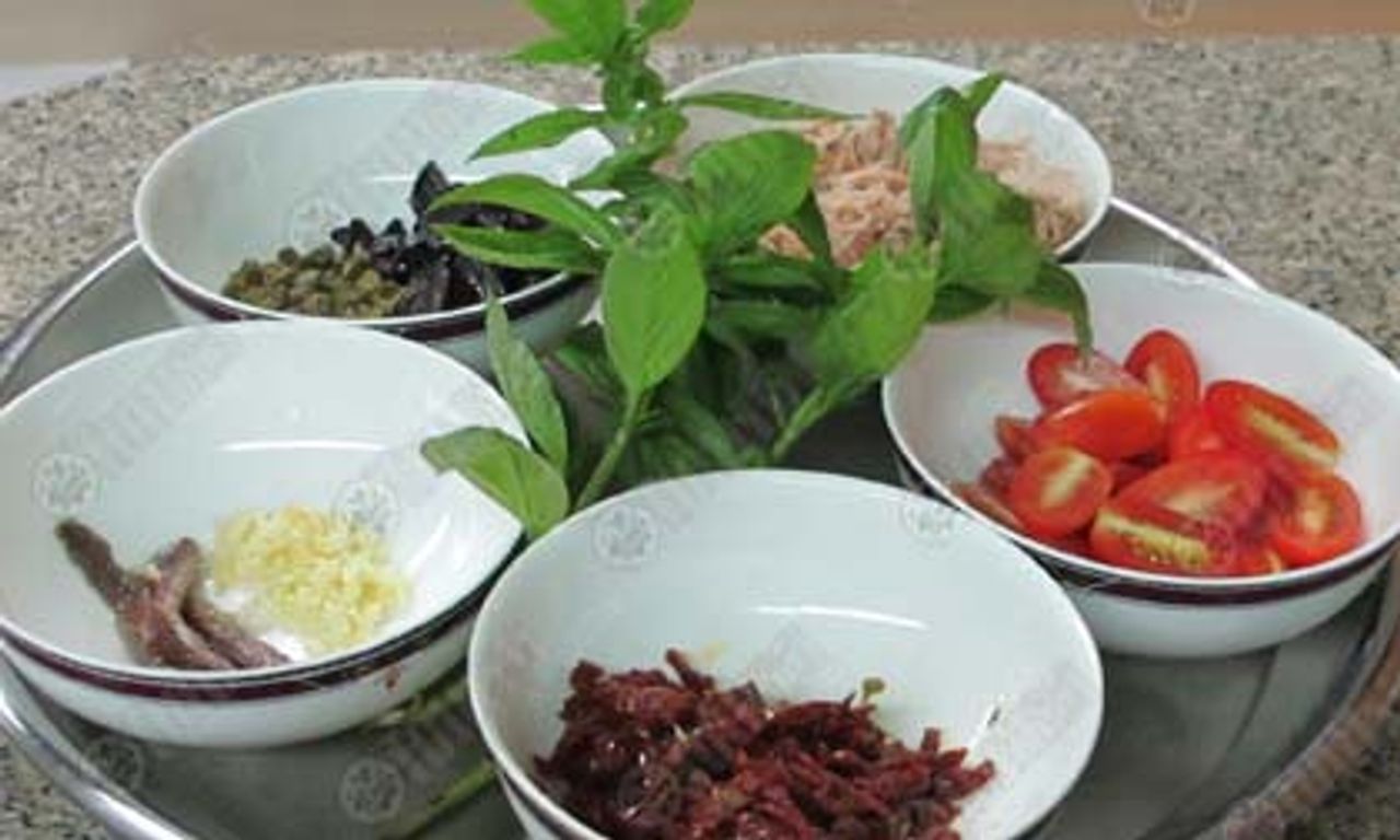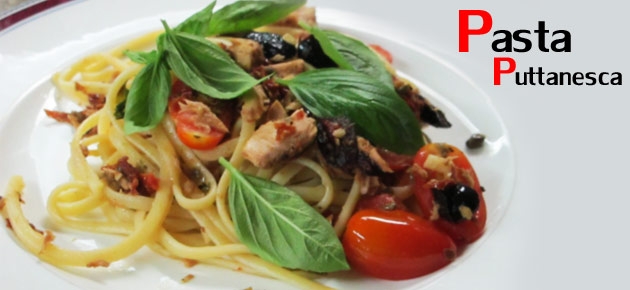 เครื่องปรุง : เส้นพาสต้าชนิด Linguini/ กระเทียมสับ/แองโชวี่ 2—3 ตัว แล้วแต่ขนาด/ มะกอกดำดองหั่นเป็นแผ่นบางๆ/ลูกเคเปอร์ สับหยาบ/มะเขือเทศแห้ง แช่น้ำมันมะกอก/ปลาทูน่า ในน้ำแร่ รสชาติจะได้ไม่เค็ม/มะเขือเทศสดลูกเล็ก/ใบโหระพา/เกลือ/พริกไทย/น้ำมันมะกอก