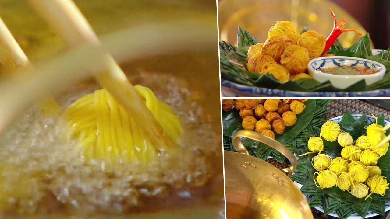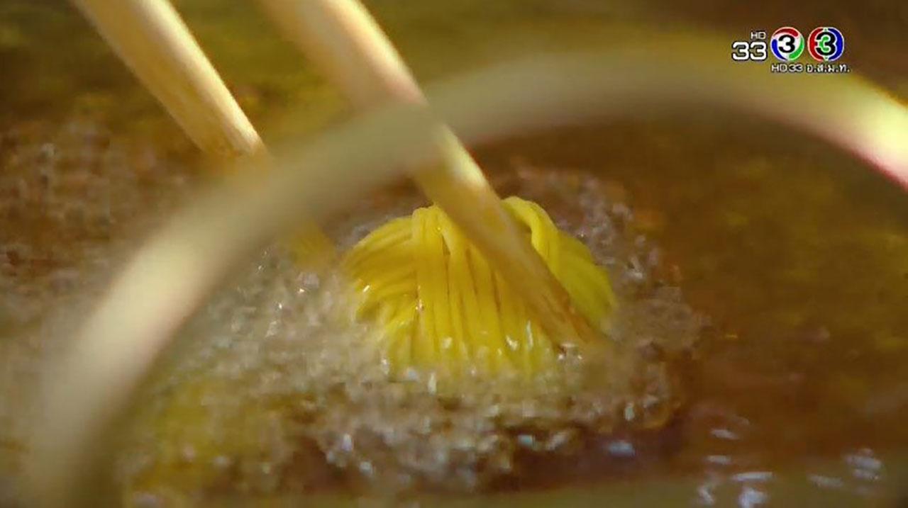 พออยู่ตัวค่อยเกลี่ยออกจะตะแกรง ทอดต่อจนสีเปลี่ยนเป็นเหลืองทอง แล้วตักขึ้นสะเด็ดน้ำมัน
