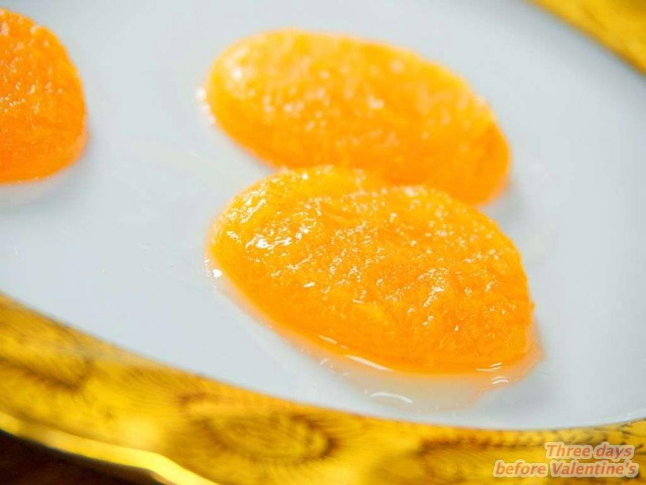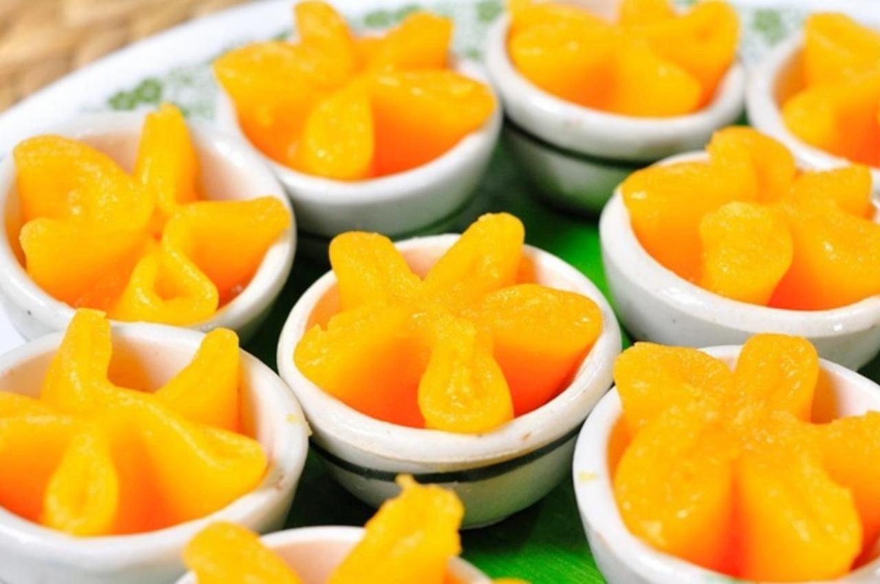 - รอให้ไข่สุก ตักแผ่นไข่ที่หยอดไว้ใส่ถาดให้สะเด็ดน้ำเชื่อม