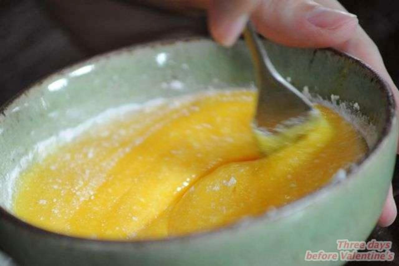 - นำไข่แดงใส่ผ้าขาวบางรีดเยื่อไข่ออก ผสมไข่แดงกับน้ำค้างไข่ คนให้เข้ากัน