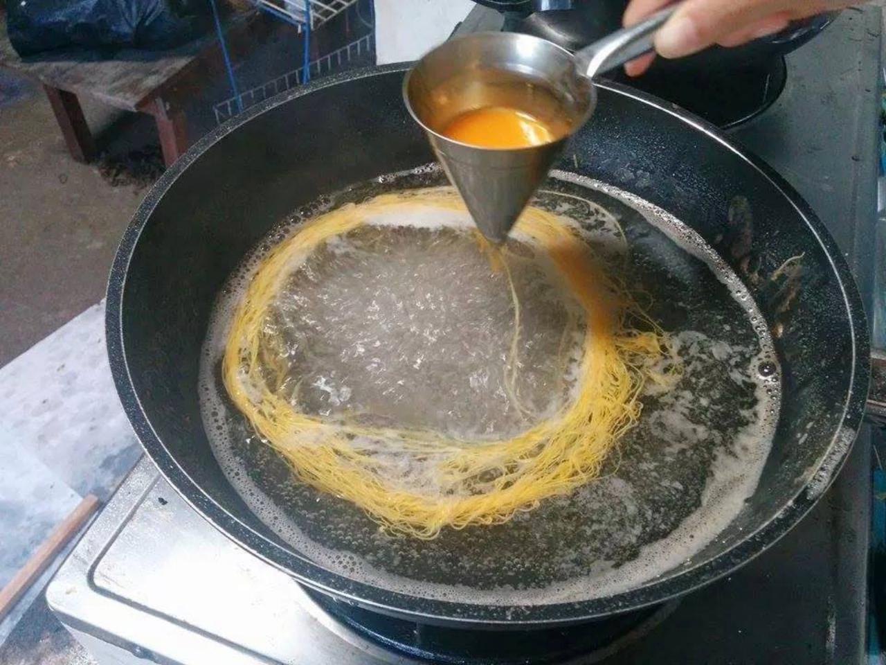 - นำไข่แดงในกรวย มาโรยในน้ำเชื่อมเดือดๆ วนไปรอบๆ กระทะ ประมาณ 20-30 รอบ