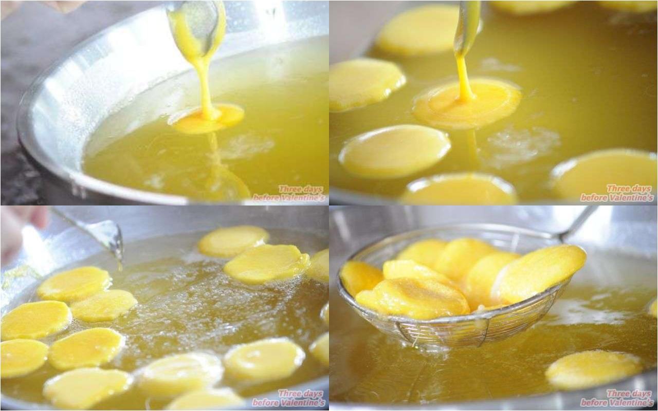 - ใช้หางช้อนโต๊ะ ตักน้ำไข่แล้วหยอดไข่ลงในน้ำเชื่อมเดือดๆ ที่ตั้งอยู่บนไฟ