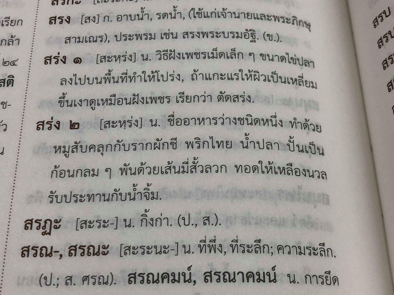 "ตามพจนานุกรมคำว่า สร่ง ๑ (สะหฺร่ง) น. คือ วิธีฝังเพชรเม็ดเล็ก ๆ ขนาดไข่ปลาลงไปบนพื้นที่ทำให้โปร่ง, ถ้าแกะแรให้ผิวเป็นเหลี่ยมขึ้นเงาดูเหมือนฝังเพชร เรียกว่า ตัดสร่ง. / สร่ง ๒ (สะหฺร่ง) น. ชื่ออาหารว่างชนิดหนึ่ง ทำด้วยหมูสับคลุกกับรากผักชี พริกไทย น้ำปลา ปั้นเป็นก้อนกลม ๆ พันด้วยเส้นหมี่สั้วลวก ทอดให้เหลืองนวล รับประทานกับน้ำจิ้ม"