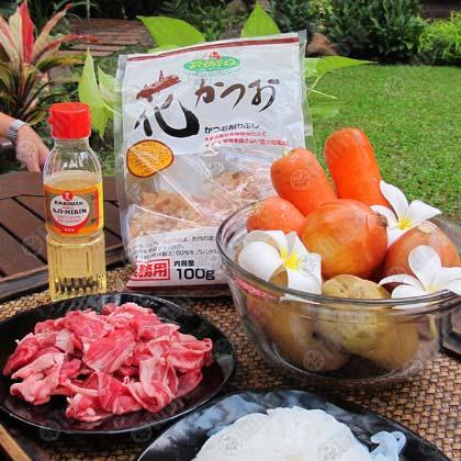 เครื่องปรุง : เนื้อสามชั้นไทยเฟรนช์สไลด์บางๆ 200 กรัม/ปลาโอแห้งสไลด์ ฝอยๆใช้ทำน้ำซุป หรือจะใช้น้ำซุปผงฮอนดาชิก็ได้/ซีอิ๊วญี่ปุ่น/มิริน (ซอสปรุงรสชนิดหนึ่งซึ่งหมักจากข้าวญี่ปุ่น จะมีรสหวาน)/น้ำตาลทราย/น้ำมันพืช/ เส้นคอนยักกุ หรือเส้นบุก/หอมหัวใหญ่/มันฝรั่ง