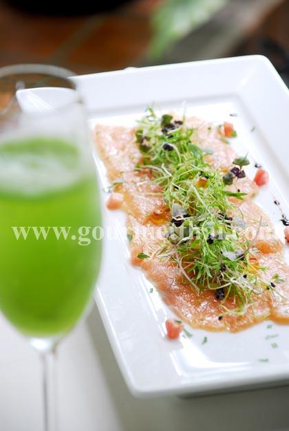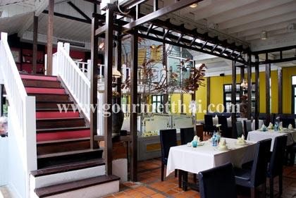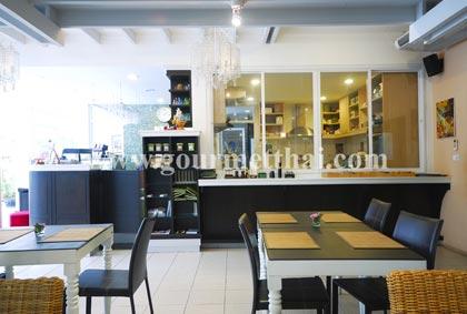 ในส่วนของโซน Dinning บรรยากาศสบายๆ ติดกับโซนบาร์ ซึ่งใช้ราวบันไดไม้เก่าของบ้านทำใหม่เป็นเคาน์เตอร์บาร์สไตล์นิวยอร์ก พร้อมกับการทานอาหารสดๆ ใหม่สไตล์โฮมเมด เช่น Slamon Gazpacho ปลาแซลมอนสดๆ สไลด์บางๆ เสิร์ฟกับผักไมโคร จานต่อมาคือเมนูที่นำคิงส์ฟิชเยลโลเทล มาหมักกับสมุนไพรตะวันตก ย่างแบบสุกนอกดิบใน ราดด้วยซอสมิริน จานนี้จึงมีทั้งกลิ่นอายของตะวันตกและตะวันออกผสมกัน.
