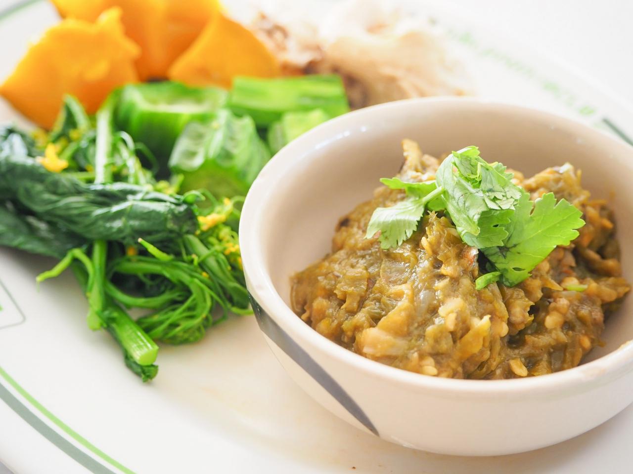 เมนูนี้เป็นอาหารไทยภาคเหนือที่เรียกว่า น้ำพริก (Dip) ที่ทำจากพริก หอมแดง กระเทียม นำทั้งหมดย่างไฟจนสุกหอม ก่อนตำเป็นน้ำพริกท้องถิ่น มักกินคู่กับผักต้มและข้าวเหนียวนึ่ง ซึ่งก็นับเป็นอาหารสุขภาพอย่างดีเลย แต่ถ้าจะให้อร่อยขึ้นไปอีก ต้องกินกับข้อไก่ทอด บอกเลยว่าอร่อยเพลินไม่สนใจแคลอรีกันเลยทีเดียว