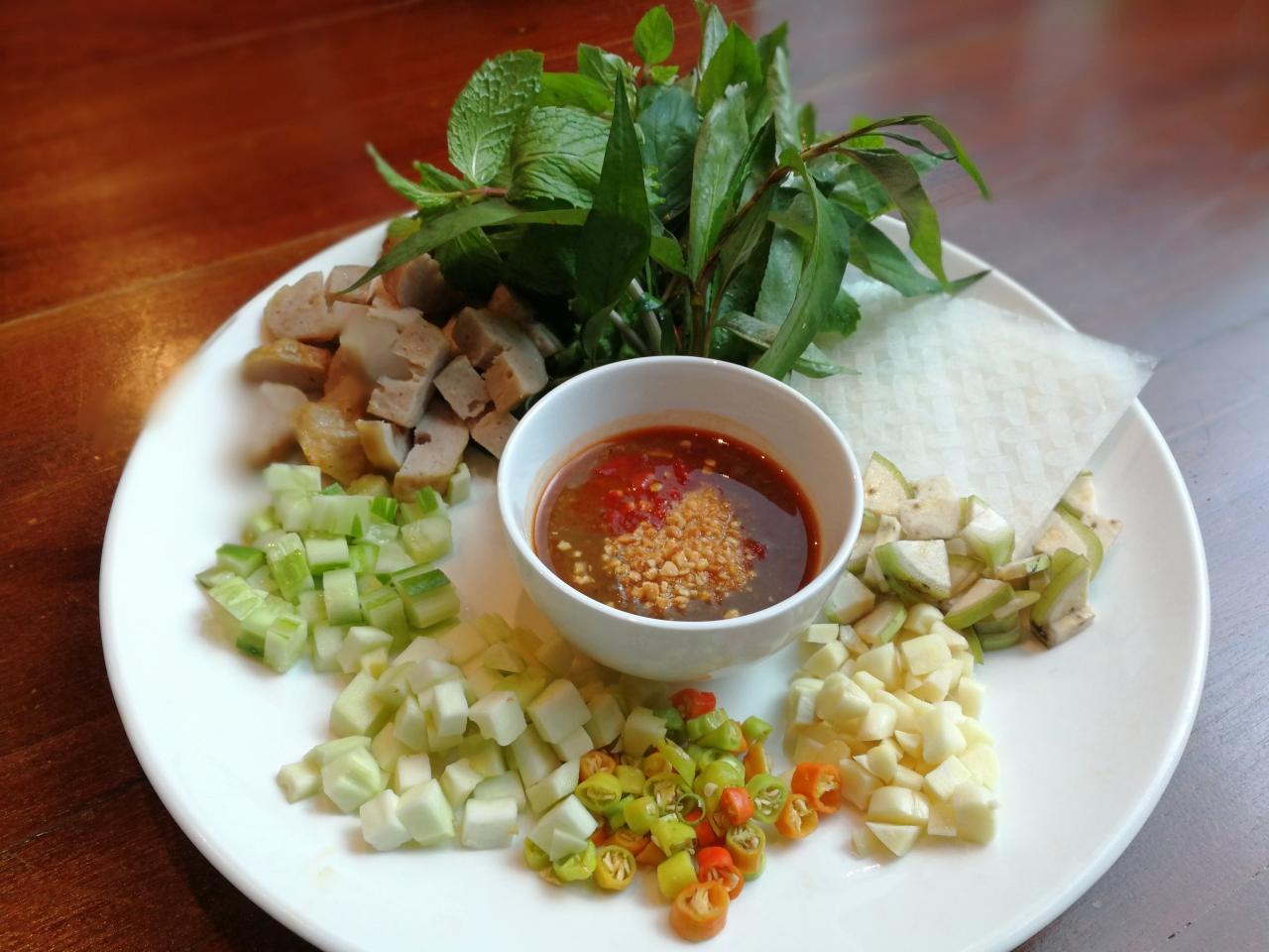 ถัดมาเป็นเมนูไซส์ใหญ่ มาพร้อมเครื่องเคราจัดเต็มเช่นกัน นั่นคือ แหนมเนือง เมนูอร่อยฉลองปีใหม่ฟินๆ กันได้ทั้งบ้าน มันสนุกตรงที่ได้หยิบผัดต่างๆ และเครื่องเคียงโน่น นั่น นี่ มาห่อใส่แผ่นแป้งได้ตามใจชอบ แล้วราดด้วยน้ำจิ้มอร่อยๆ สูตรเฉพาะของเมนูแหนมเนือง แค่คิดก็น้ำลายไหล... อยากกินแล้วอะ!