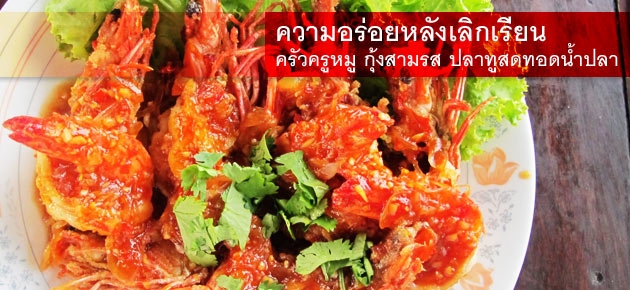 เมนูแรกที่ยากจะลืม หม่ำแล้วนอนตื่นขึ้นมายังเพ้อ คือ "กุ้งสามรส" กุ้งตัวโตคัดแบบสดๆ เนื้อแน้น...แน่น ทอดในน้ำมันใหม่