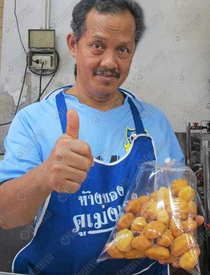 เทคนิคของการอบขนมไข่ให้กรอบนอกนุ่มใน อยู่ที่ความ "ตาไว" เพราะลุงไม่ได้อบแบบตั้งเวลาอัตโนมัติ ติ๊ง ปั๊บ จับออก แต่คุณลุงจะทยอยใส่ทีละถาด และหมั่นเปิดตู้ ขยับ พลิก บิด ดูทีละชิ้น ชิ้นไหนเหลืองเข้มได้ที่ก็จิ้มออกมาผึ่งให้เย็น รอใส่ถุงพร้อมขาย แล้วหยอดใส่เข้าไปใหม่ ขนมแต่ละชิ้นใช้เวลาอบไม่เท่ากัน คนทำต้องขยันอย่างแรง หมั่นเปิดหมั่นดู ถึงจะได้ขนมไข่ที่กรอบนอก นุ่มใน อร่อยเพลินยากเกินจะหยุด