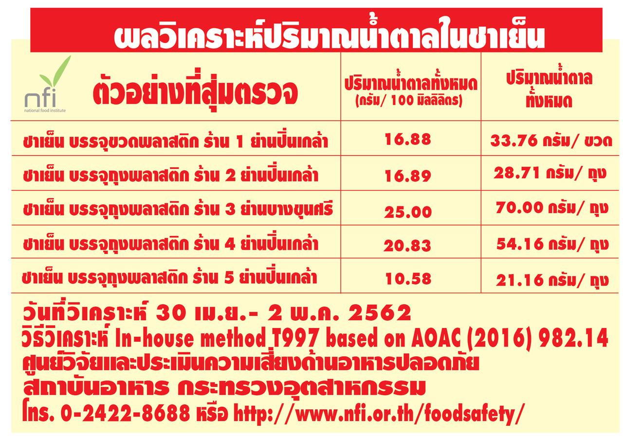 เพื่อความสบายใจ สถาบันอาหาร ได้สุ่มตัวอย่างชาเย็น 5 ตัวอย่าง จาก 5 ร้านขายเครื่องดื่มย่านปิ่นเกล้าและบางขุนศรี นำมาวิเคราะห์ปริมาณความหวานที่ได้จาก ฟรักโทส, กลูโคส, ซูโครส, มอลโทส และแล็กโทส)
