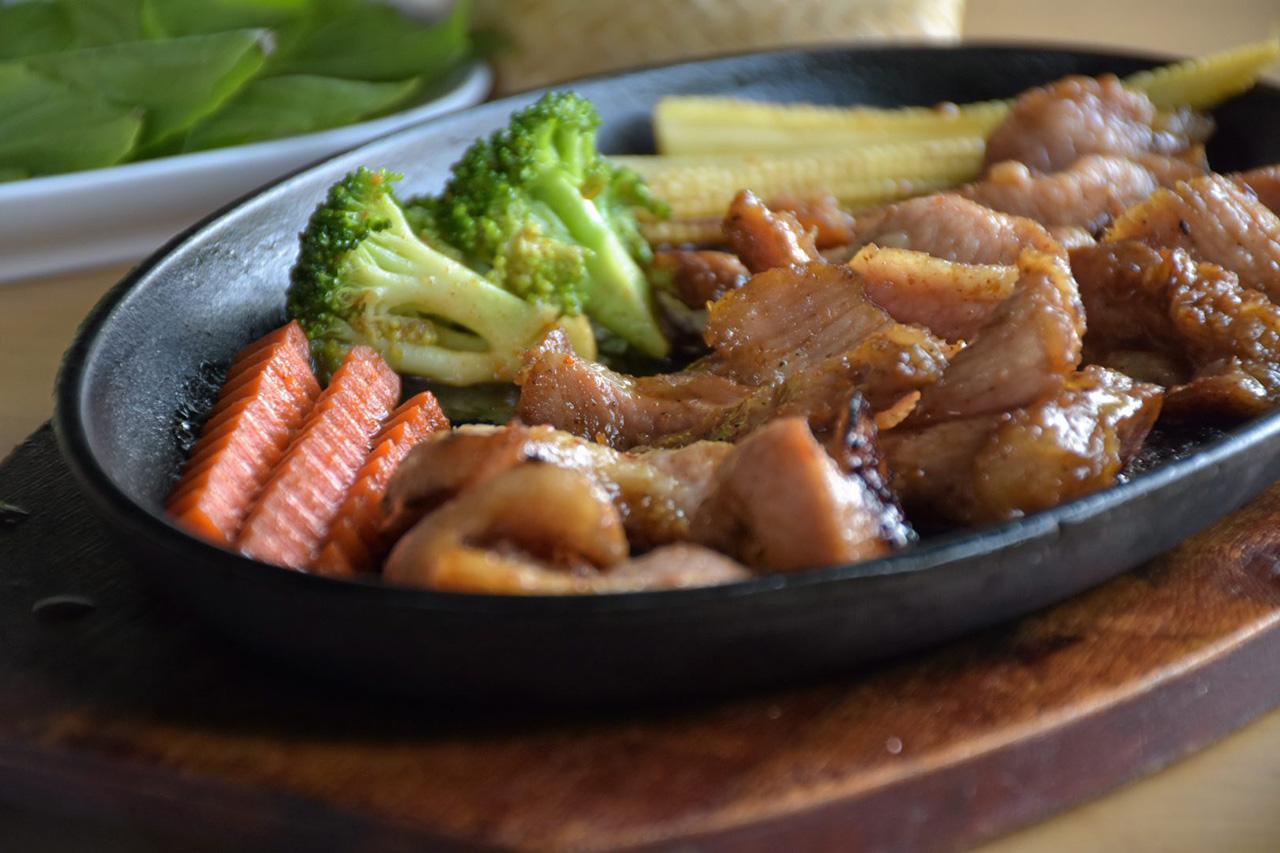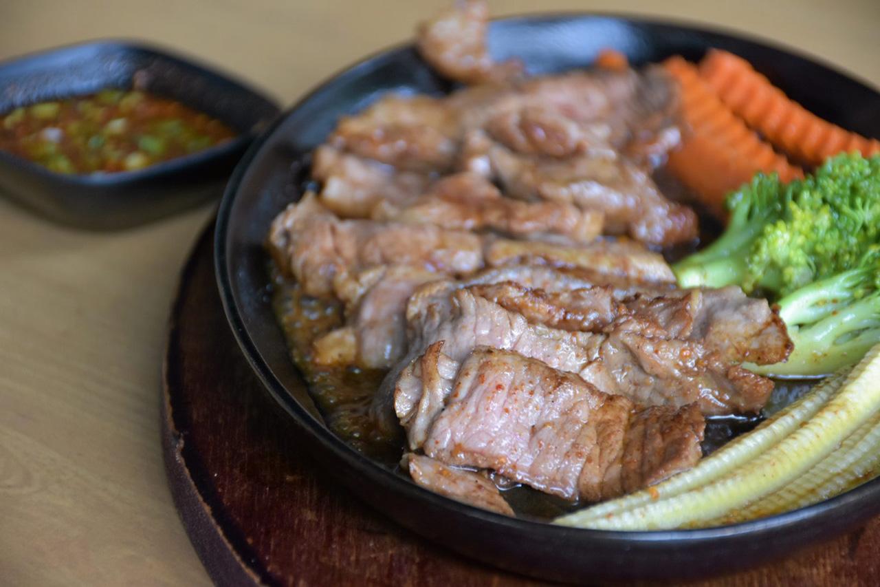 ...เสียงเดือดฉ่าๆดังไปทั่วร้าน ทั้งกลิ่นและควันหอมโชยมาแต่ไกล ผมหันไปตามเสียง เห็นพนักงานเดินถือ “เนื้อย่างกระทะร้อน” ออกจากห้องครัวไปเสิร์ฟให้ลูกค้าโต๊ะข้างๆ ต้องสั่งมาลองชิม เนื้อวัวสันในชิ้นใหญ่คลุกน้ำหมักย่างบนเตาถ่าน หั่นสไลซ์พอดีคำกำลังกิน จัดเรียงใส่กระทะร้อน ราดด้วยน้ำสูตรพิเศษของร้าน เสิร์ฟคู่กับน้ำจิ้มแจ่ว เนื้อวัวชุ่มฉ่ำนุ่มลิ้นเคี้ยวนิ่มแทบละลาย มันช่างฟินตกอยู่ในภวังค์สุข!!