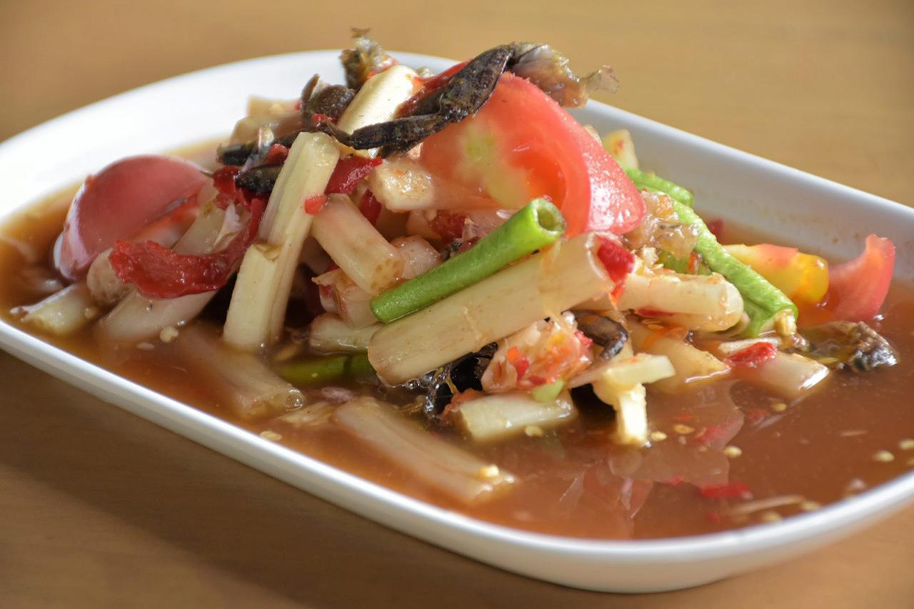 จานต่อมา “ตำไหลบัว” อีกเมนูที่ใครได้ลองต้องติดใจ วิธีทำเหมือนส้มตำทุกอย่าง เพียงแต่เปลี่ยนวัตถุดิบหลักจากมะละกอเป็นไหลบัว หั่นไหลบัวเป็นท่อนพอดีคำ ยาวชิ้นละ 2 นิ้ว ตำบุๆคลุกเคล้าให้เข้ากันกับน้ำส้มตำ ตัวไหลบัวมีความกรอบ เวลาเคี้ยวได้อรรถรสสนุกปาก