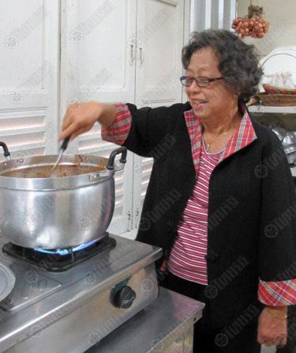 เคล็ดลับ ขณะเคี่ยวหมั่นคนเพื่อไม่ให้แกงติดก้นหม้อ และถ้าน้ำงวดมากไป ก็สามารถเติมน้ำได้.