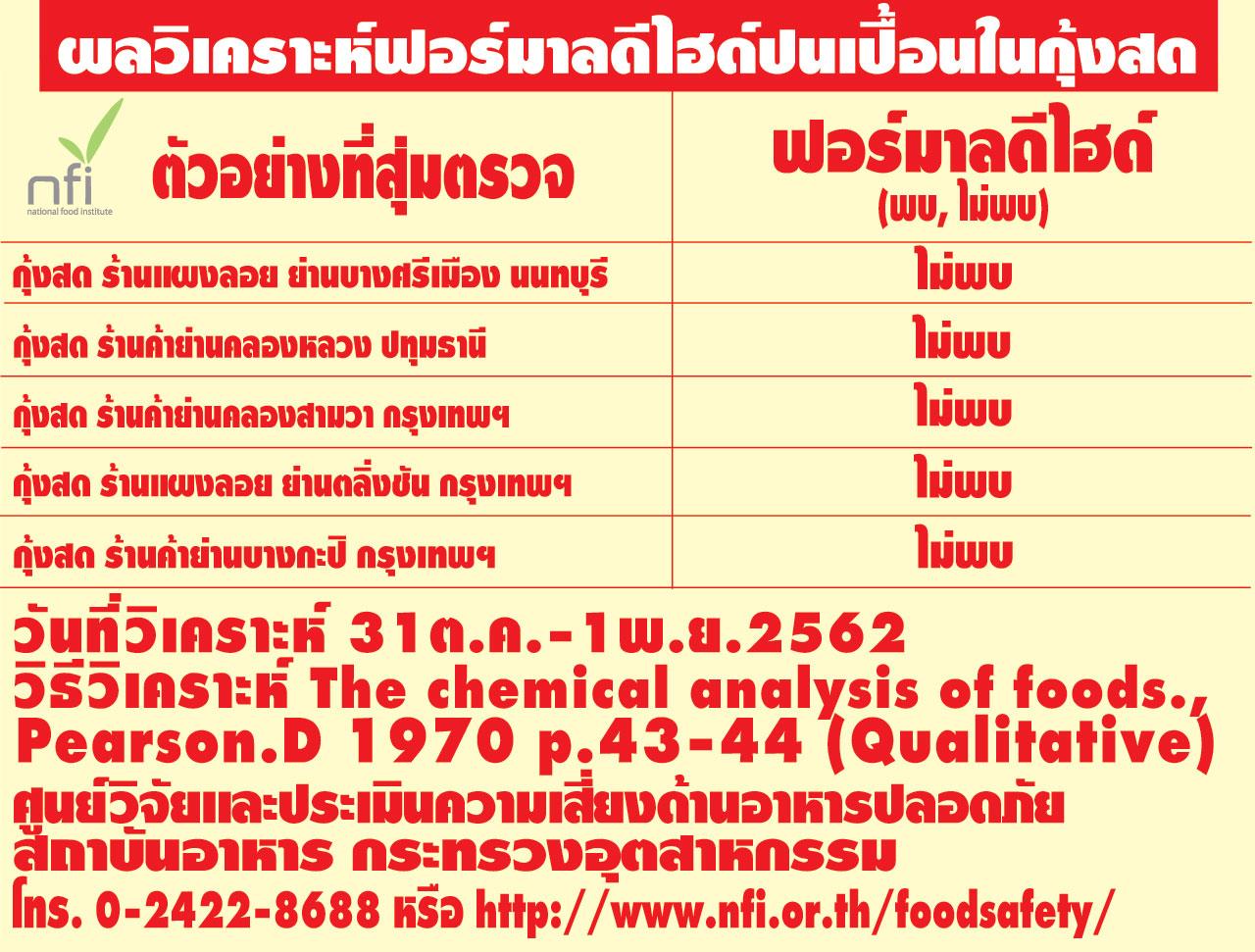เพื่อให้ผู้บริโภคระมัดระวังการเลือกซื้ออาหารทะเลสด สถาบันอาหารได้ทำการสุ่มตัวอย่างกุ้งสด 5 ตัวอย่างจาก 5 ย่านการค้าในเขตกรุงเทพฯ และปริมณฑลนำมาวิเคราะห์ ผลที่ได้พบว่ากุ้งสดทุกตัวอย่างไม่มีสารฟอร์มาลดีไฮด์ปนเปื้อน