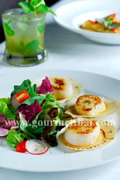บรรยากาศของแฟตฟิชดูโปร่งโล่ง ไม่อึดอัดด้วยกระจกใส แถมได้กำแพงอิฐที่ประดับภาพถ่ายขาว-ดำของเมืองปารีสก็ช่วยสร้างบรรยากาศแบบที่เป็นกันเองในอารมณ์ของเฟรนช์บิสโทร แต่แอบผสมความดิบในแบบฉบับนิวยอร์ก เติมความสดใสของท้องทะเลด้วยสีฟ้าอมเขียว และเนื่องจากสองสาวอยากให้แขกผู้มาเยือนได้ใกล้ชิดกันจึงได้ออกแบบโซฟายาวขนานไปกับกำแพงอิฐซึ่งช่วยสร้างความคึกคักให้กับร้านด้วยความเป็นซีฟู้ดบิสโทรสไตล์ยุโรป ที่นี่จึงมีวัตถุดิบชั้นเลิศที่หลากหลายจากกระแสน้ำเย็นของแถบยุโรปและอเมริกาให้เลือกมากมาย ไม่ว่าจะเป็นหอยนางรม ปลา กุ้ง หอย เริ่มต้นเรียกน้ำย่อยด้วยค็อกเทลสูตรเด็ด CHE วอดก้าน้ำผึ้งมะนาวเย็นชื่นใจ ต่อด้วยจานเรียกน้ำย่อย Sizzling Prawns with Moroccan Spices, Pita Bread & Ebiko Cream Dip กุ้งทอดกับเครื่องเทศโมร็อกกัน จิ้มกับดิปครีมไข่กุ้งที่ออกเปรี้ยวเล็กน้อย แต่เข้ากับกลิ่นของเครื่องเทศ ทั้งยังได้ความกรุบของไข่กุ้งมาเพิ่มเนื้อสัมผัสก็ยิ่งอร่อยถูกปาก เสิร์ฟคู่กับขนมปังพิตา ต่อด้วย Roasted King Scallops in Shells with White Wine and Herb Butter หอยเชลล์บิ๊กไซส์เนื้อหวานฉ่ำอบกับไวน์ขาวและเนย เสิร์ฟคู่กับสลัดผัก