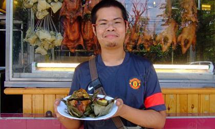 เมนูแรกที่กระแทกหูเจ๊แซบตั้งแต่แวบแรกที่ได้ยินคือ “บ๊ะจ่างเป็ดย่าง” ชื่อฟังดูเก๋ไก๋แถมยังใช้เป็ดเนื้อนุ่มของเฮียตี่มาเป็น ส่วนผสมสำคัญรับประกันในรสชาติและความนุ่ม ตัวข้าวไม่เลี่ยน ไม่มัน เหนียวนุ่มกำลังน่าเคี้ยว เป็นข้าวเหนียวเขี้ยวงูแช่ทิ้งไว้ค้างคืน วันรุ่งขึ้นนำมาผัด กับน้ำราดเป็ดที่ทางร้านเฮียตี่ทำไว้สดๆ ใหม่ๆทุกวัน ผัดจนน้ำซึมเข้าไปในเม็ดข้าวโดยไม่ใส่น้ำมัน ทำให้ข้าว ไม่เลี่ยนไม่มันจนเกินไป จากนั้นนำไปห่อรวมกับส่วนผสมอื่นๆ มีเป็ดย่าง แปะก๊วย ไข่เค็ม กุ้งแห้ง พุทราจีน เม็ดบัว เห็ดหอม และเผือกกวน ห่อให้สวยงามแล้วนำไปนึ่ง