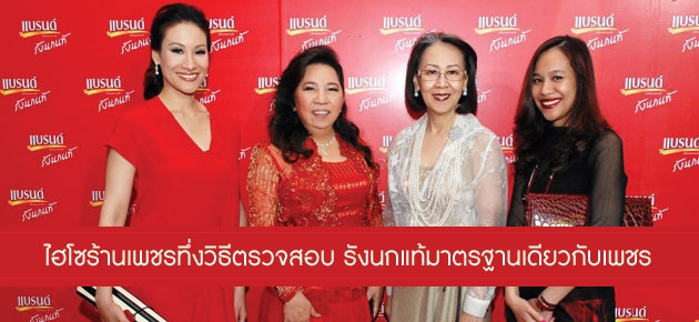 ต้องบอกว่าไม่ธรรมดาจริงๆ สำหรับงานเปิดตัวแคมเปญใหม่ “แบรนด์รังนกแท้ มาตรฐานการตรวจสอบเดียวกับเพชร” ที่จัดขึ้น ณ โรงแรมสยาม เคมปินสกี้ โดยเหล่าไฮโซคนดังต่างพร้อมใจกันขนเครื่องเพชรแท้สุดหรูของตัวเองมาประชันกัน เพื่อร่วมการันตีความเชื่อมั่นที่มีต่อผลิตภัณฑ์แบรนด์รังนกแท้ที่ใช้มาตรฐานการตรวจสอบเดียวกับเพชร และยังมาให้กำลังใจ “เดอะหนึ่ง–สุริยน ศรีอรทัยกุล” ไฮโซชื่อดังเจ้าของร้านเพชรบิวตี้ เจมส์ ที่รับเป็นแบรนด์แอมบาสเดอร์ให้กับผลิตภัณฑ์แบรนด์รังนกแท้ ในภาพยนตร์ประชาสัมพันธ์ชุดใหม่ ร่วมกับสองสามีภรรยา “อ้อม-พิยดา และอาท-ศรา จุฑารัตนกุล” เป็นครั้งแรก