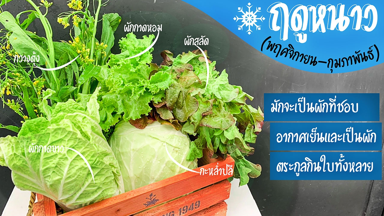 - ฤดูหนาว (พฤศจิกายน-กุมภาพันธ์) มักจะเป็นผักที่ชอบอากาศเย็น และเป็นผักตระกูลกินใบทั้งหลาย