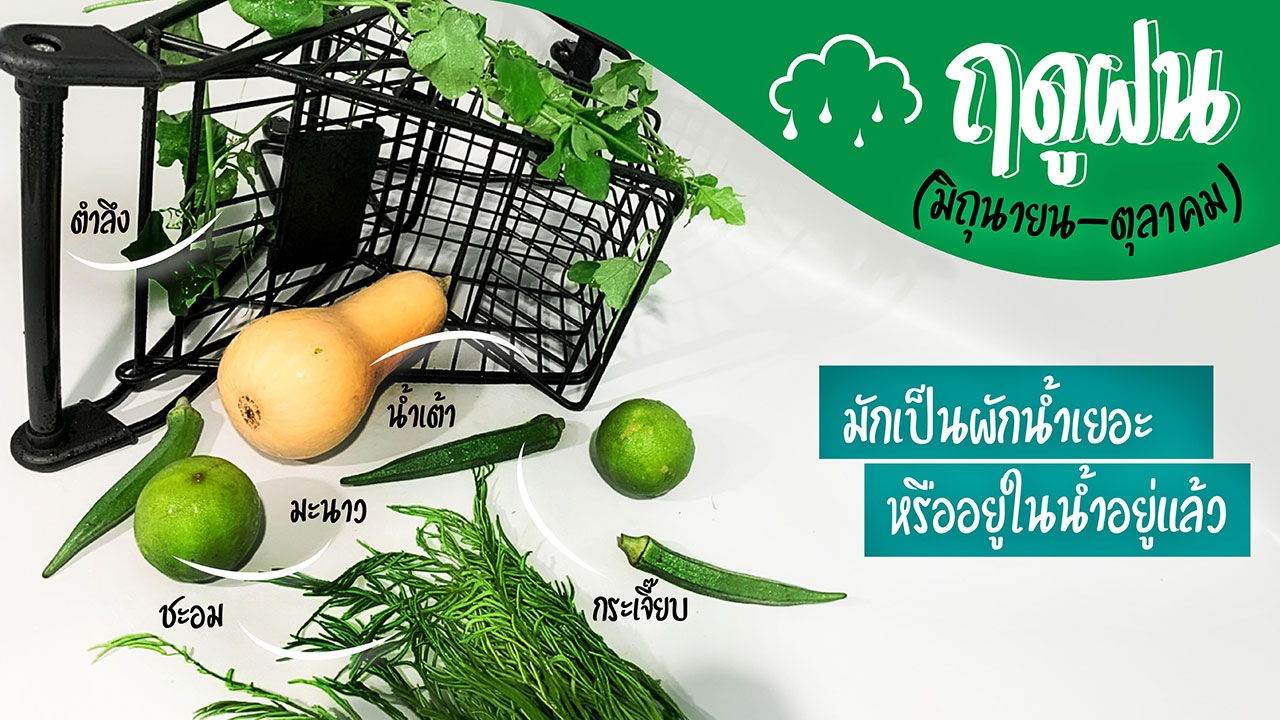 - ฤดูฝน (มิถุนายน-ตุลาคม) มักเป็นผักน้ำเยอะหรืออยู่ในน้ำอยู่แล้ว