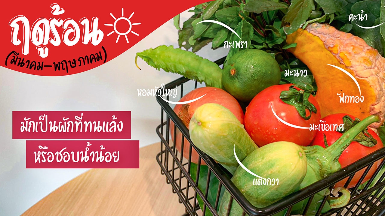 - ฤดูร้อน (มีนาคม-พฤษภาคม) มักเป็นผักที่ทนแล้งหรือชอบน้ำน้อย