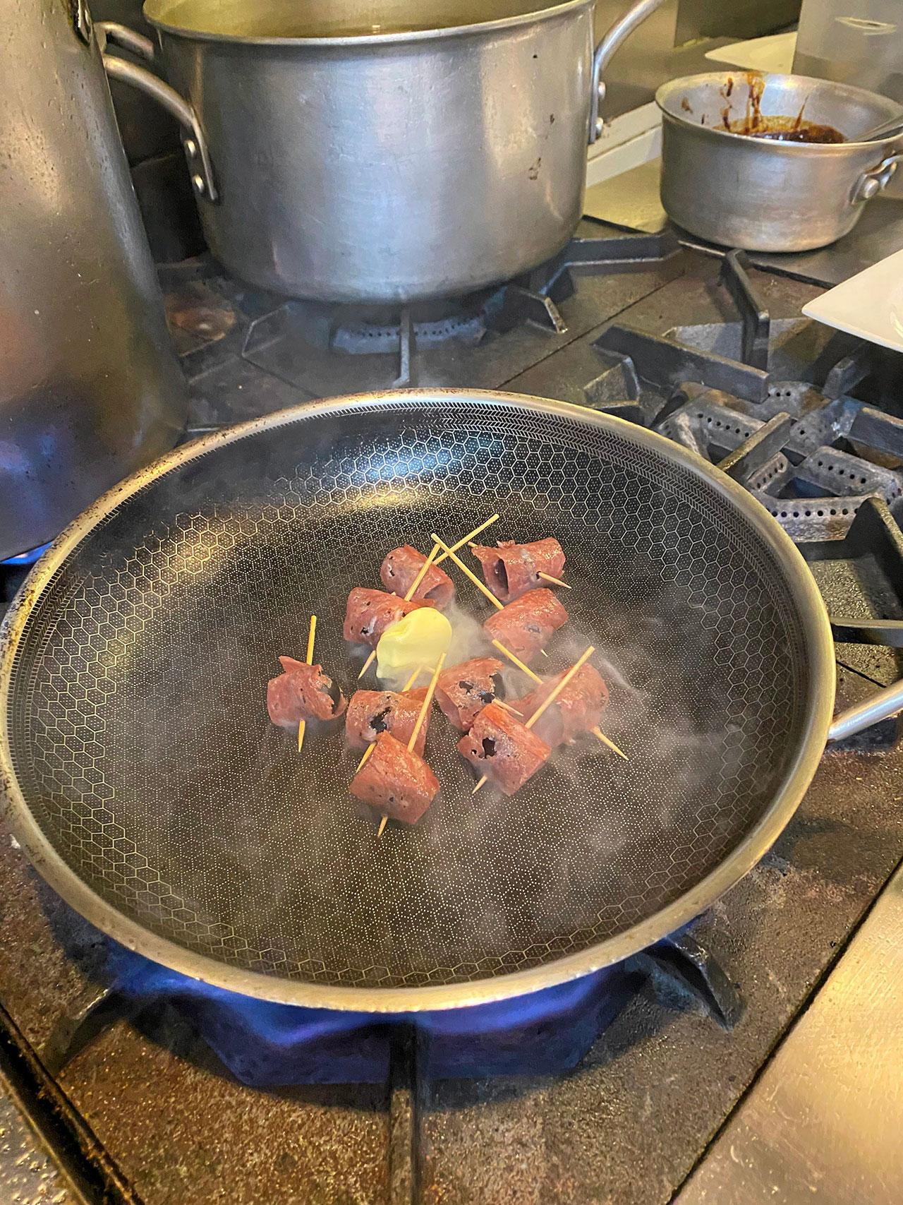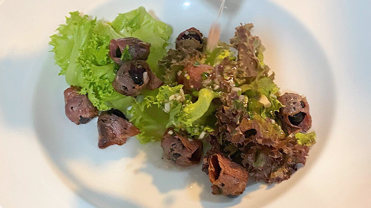 จากนั้นเริ่มจากการเตรียมองุ่นที่สดและกรอบ นำมาพันด้วยซาลามี่ทั้งหมด 12 ลูก แล้วนำองุ่นพันด้วยซาลามี่ไปทอดกับเนยในกระทะร้อนๆพอให้ซาลามี่กรอบ แล้วพักไว้ ล้างและจัดเตรียมผักสลัดร็อกเกต ผักสลัดต่างๆ หอมแดงสไลด์ แรดิชแดงสไลด์ นำผักสลัดต่างๆใส่จานที่จะเสิร์ฟ แล้วราดด้วยน้ำสลัดให้ทั่ว นำซาลามี่ที่ทอดสุกแล้วมาวางบนจานสลัดอีกที่นึงเป็นอันพร้อมเสิร์ฟ.
