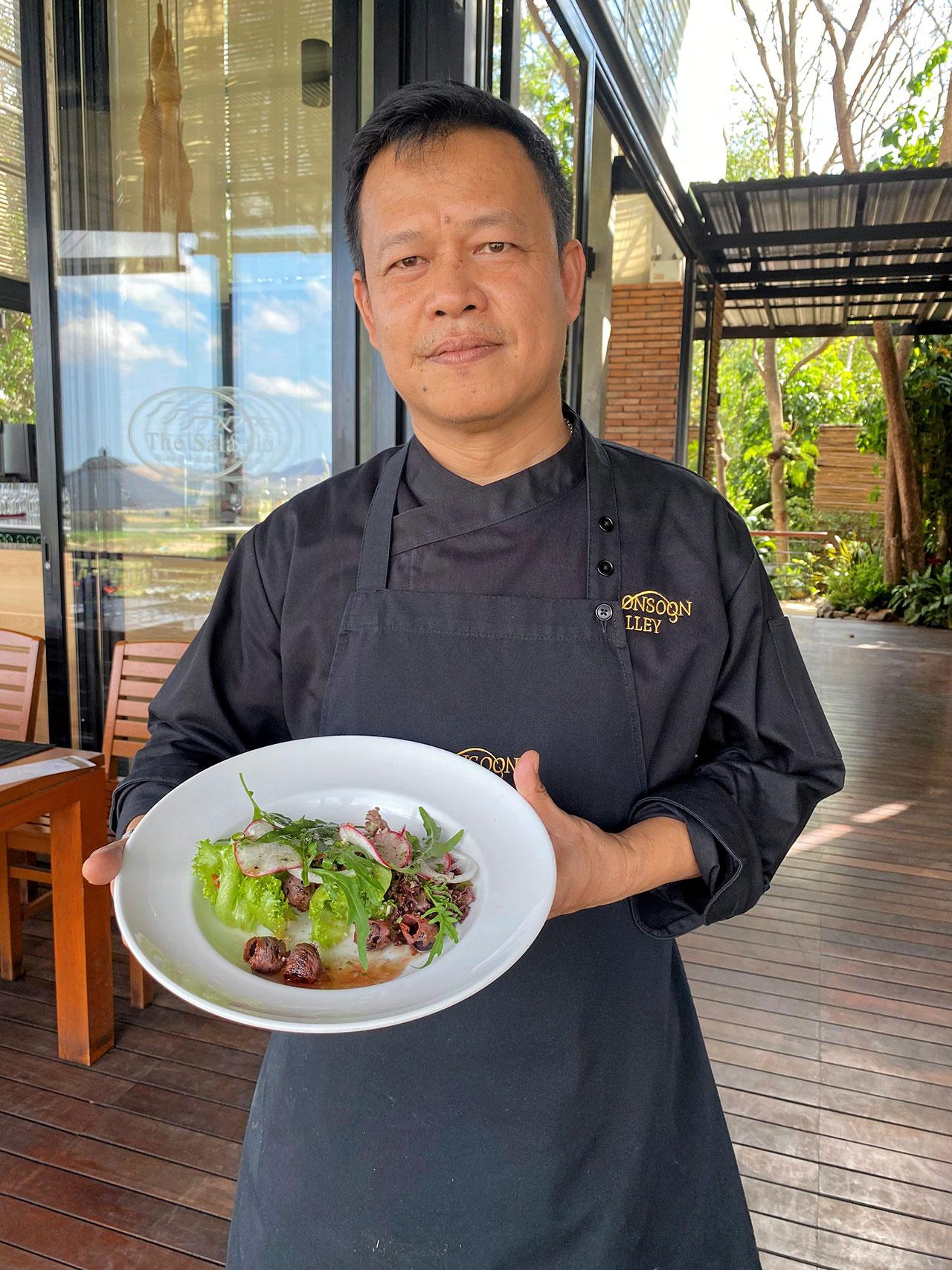 หลายคนคงฝันอยากเป็นเชฟทำอาหาร แต่สำหรับ เชฟกบ-กิตติ ขันติวงษ์ Head Chef แห่งเดอะ ศาลา (The SALA wine bar and bistro) ร้านอาหารสไตล์ ฟิวชันใน Mon-soon Valley Vineyard ไร่องุ่นแห่งแรกและแห่งเดียวใน อ.หัวหิน จ.ประจวบคีรีขันธ์ ที่โอบล้อมด้วยขุนเขาบนเนื้อที่เป็นพันไร่ เริ่มต้นอาชีพในเส้นทางนี้ด้วยความบังเอิญ ไม่เคยคิดหรือวางแผนว่าจะเป็นเชฟเลย แต่ก้าวเข้ามาจากบริบทรอบข้าง โดยเริ่มต้นจากการเป็นเด็กเสิร์ฟ ในโรงแรม 5 ดาว บนถนนสุขุมวิท จากนั้นได้มีโอกาสสัมผัสกับพ่อครัวหรือเชฟฝรั่งในโรงแรม จนมีความรู้สึกว่าการเป็น “เชฟ” มีสิ่งที่ท้าทายมากมาย จากนั้นจึงได้เริ่มฝึกฝนการทำอาหารจนมาถึงทุกวันนี้ และก้าวมาเป็น “เชฟ” คนทำอาหารที่ภูมิใจกว่า 20 ปีแล้ว
