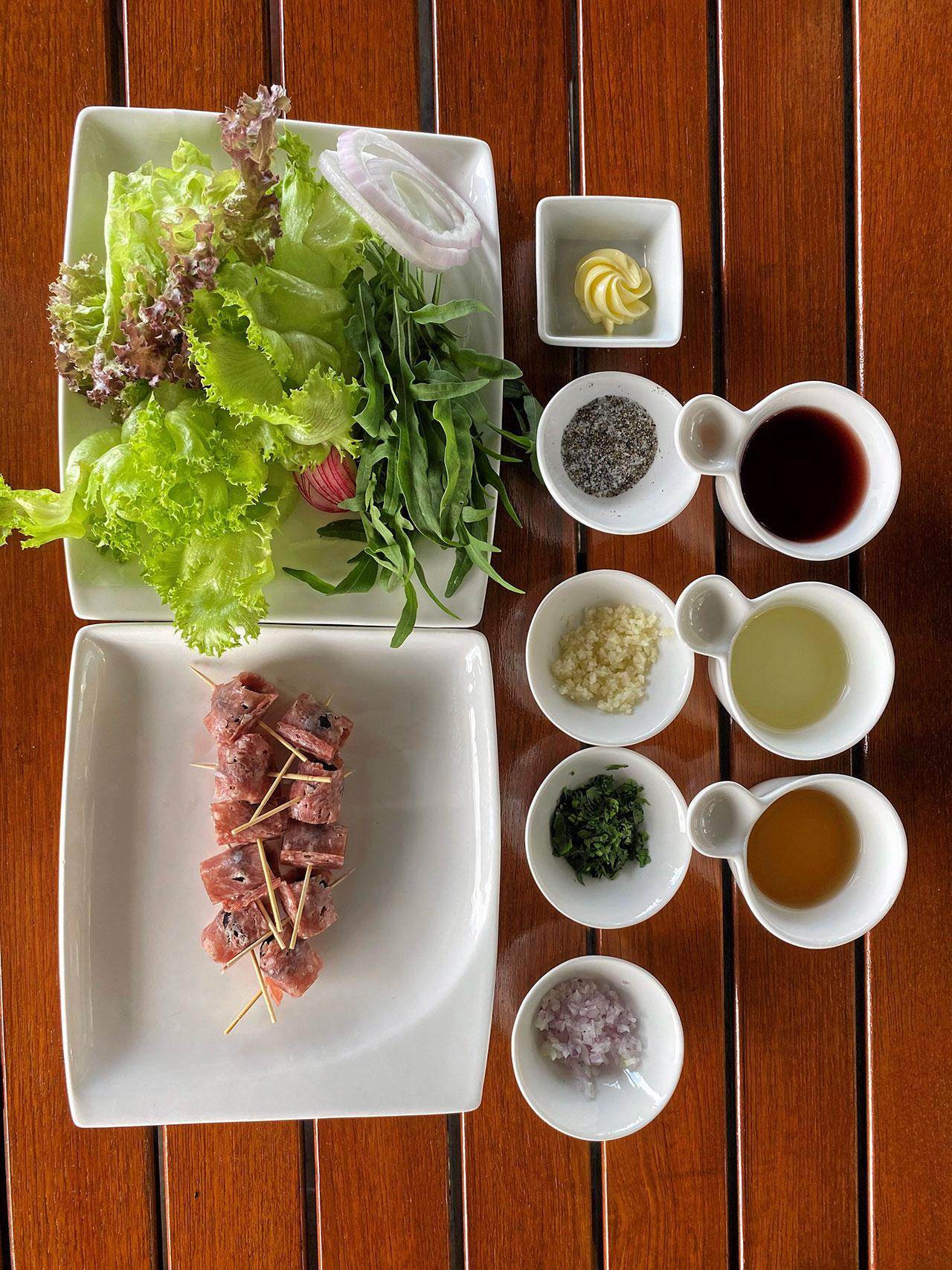 องุ่นแดง 12 ลูก, ซาลามี่ 50 กรัม, เนย 30 กรัม, เครื่องปรุงสลัด ร็อกเกตสลัด 10 กรัม, ผักสลัดต่างๆ 50 กรัม, แรดิชแดง 10 กรัม, หอมแดง 20 กรัม, พริกสด 1 เมล็ด ผักชี กระเทียม โอลีฟออยล์ และซอสน้ำส้มไวน์แดง