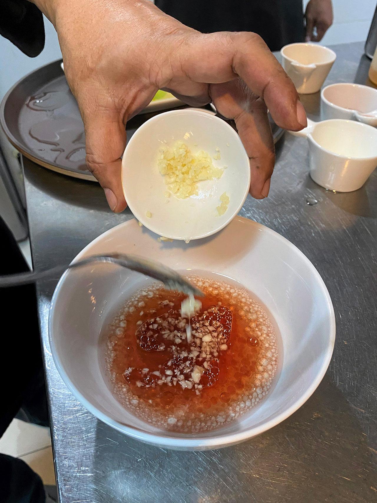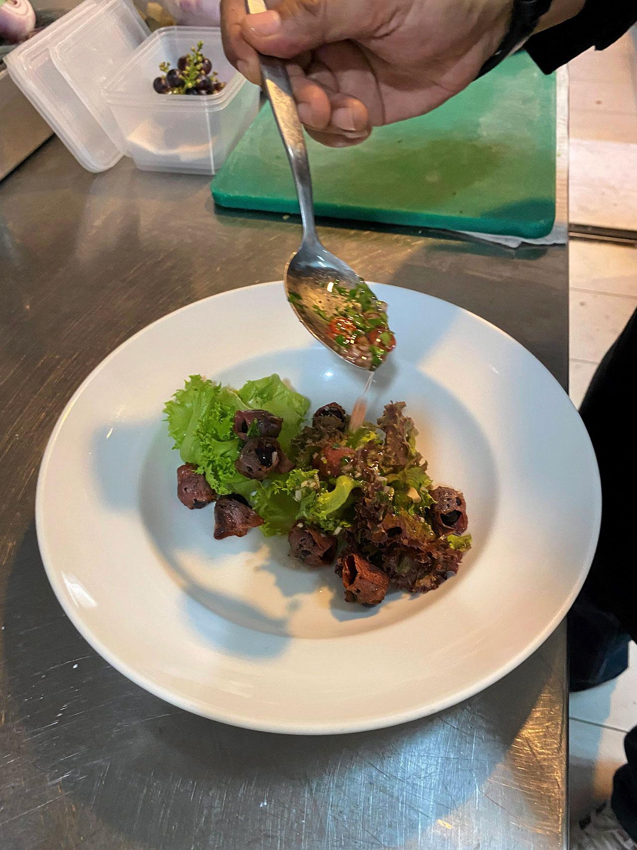 เริ่มด้วยการทำน้ำสลัดฯส้มไวน์แดง นำวัตถุดิบ ต่างๆ เช่น หอมแดง กระเทียม พริก ผักชี น้ำส้มไวน์แดง น้ำมันโอลีฟออยล์ มารวมกันแล้วนำไปปั่นหยาบๆรวมกัน ปรุงรสด้วยเกลือและพริกไทยดำตามชอบ